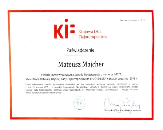 Bardzo polecam Mateusza. Przede wszystkim za jego profesjonalizm i indywidualne podejście do pacjenta, do tego za ogromną wiedzę jaką posiada. Moje problemy zdrowotne są skutecznie rozwiązywane. Każda wizyta jest komfortowa, ale i pełna różnych wskazówek, które pomagają mi i powodują, że lepiej dbam o swoją postawę na co dzień. Mateusz jest bardzo zaangażowany w swoją pracę, cierpliwy i dba o dobro pacjenta. Widać, że praca jest jego pasją i sprawia mu przyjemność. Jest skupiony, a przy tym bardzo komunikatywny i miły. To fizjoterapeuta, któremu można zaufać i który potrafi znaleźć skuteczne rozwiązania nawet w trudnych przypadkach. Bardzo dziękuję za jego pomoc i na pewno będę wracać, gdy zajdzie taka potrzeba.