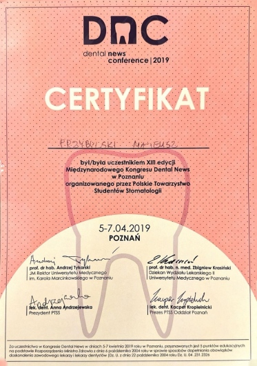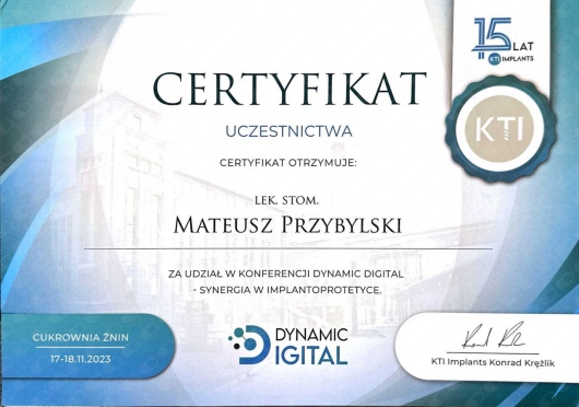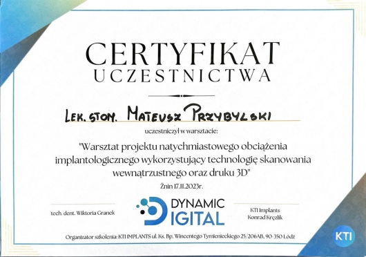 Mateusz Przybylski, dentysta z pasją, każdego dnia wchodzę do mojego gabinetu z jednym celem – aby zaoferować moim pacjentom nie tylko leczenie, ale przede wszystkim opiekę, która wykracza poza standardy. Moje doświadczenie i ciągłe poszerzanie wiedzy są fundamentem, na którym buduję relacje z pacjentami, oferując im szeroki zakres usług dentystycznych. Moja praktyka koncentruje się na leczeniu zachowawczym, protetyce oraz chirurgii specjalistycznej.