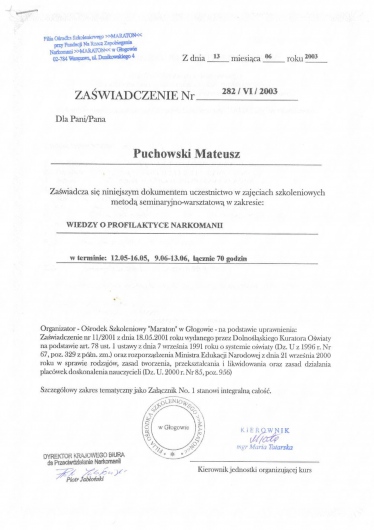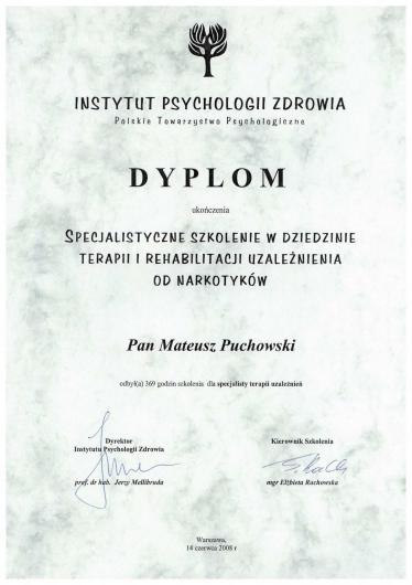 Dzięki Panu Mateuszowi poradziłem sobie ze swoim uzależnieniem, które trwało z przerwami od ponad 20 lat. Dziś jestem 16 miesięcy bez używek, a moja kondycja psychiczna jest tak silna,że już nigdy nie zawrócę z tej ścieżki i będę szedł twardo na przód w trzeźwości, a wszystko to dzięki panu Mateuszowi no i mojej narzeczonej która wierzyła we mnie i wspierała mnie.