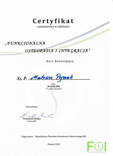 Nieustannie się rozwijam – regularnie uczestniczę w szkoleniach i kursach, bo wierzę, że skuteczna terapia zaczyna się od wiedzy, uważności i ciągłego doskonalenia.
