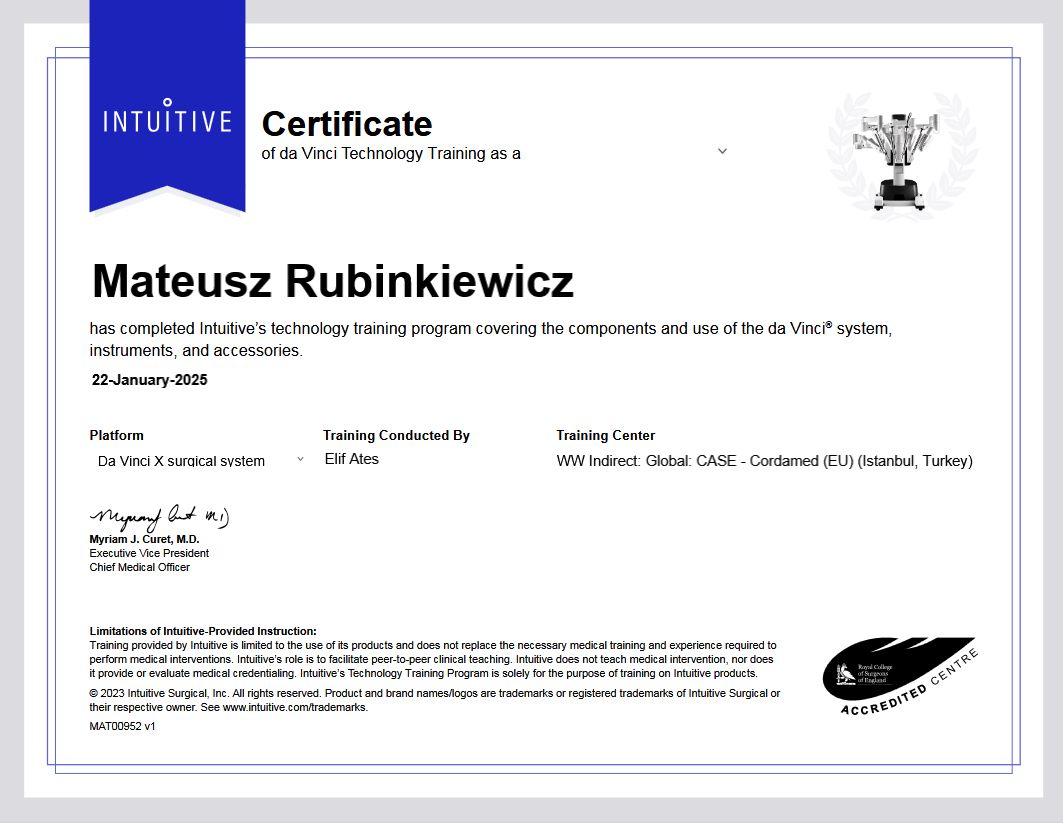 Jestem certyfikowanym chirurgiem robotycznym (system DaVinci). Prowadzę również regularnie warsztaty chirurgiczne z zakresu chirurgii minimalnie inwazyjnej.
