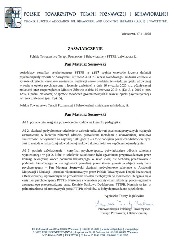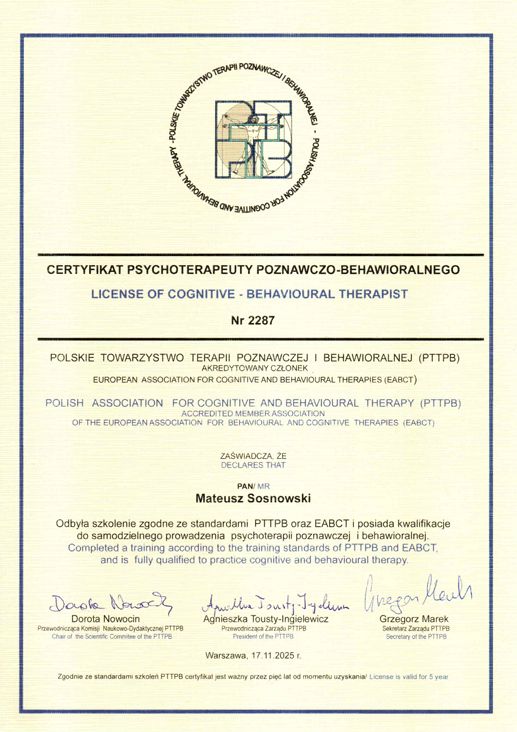 Jestem członkiem Polskiego Towarzystwa Terapii Poznawczo-Behawioralnej należącego do European Association for Cognitive and Behavioural Therapies (EABCT) Ukończyłem 4 letnie szkolenie psychoterapeutyczne z zakresu psychoterapii poznawczo-behawioralnej z dialogiem motywującym akredytowanego przez Polskie Towarzystwo Terapii Poznawczej i Behawioralnej (PTTPB) i Europejskie Towarzystwo Terapii Poznawczej i Behawioralnej (EABCT)