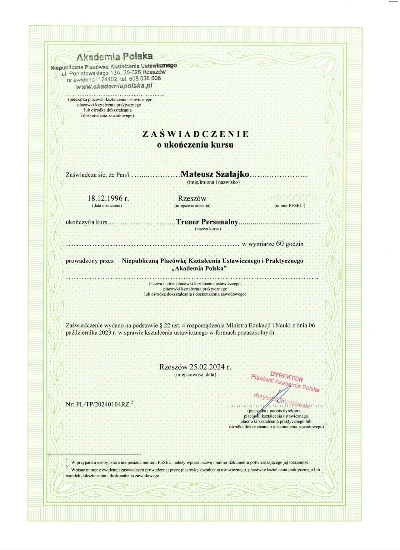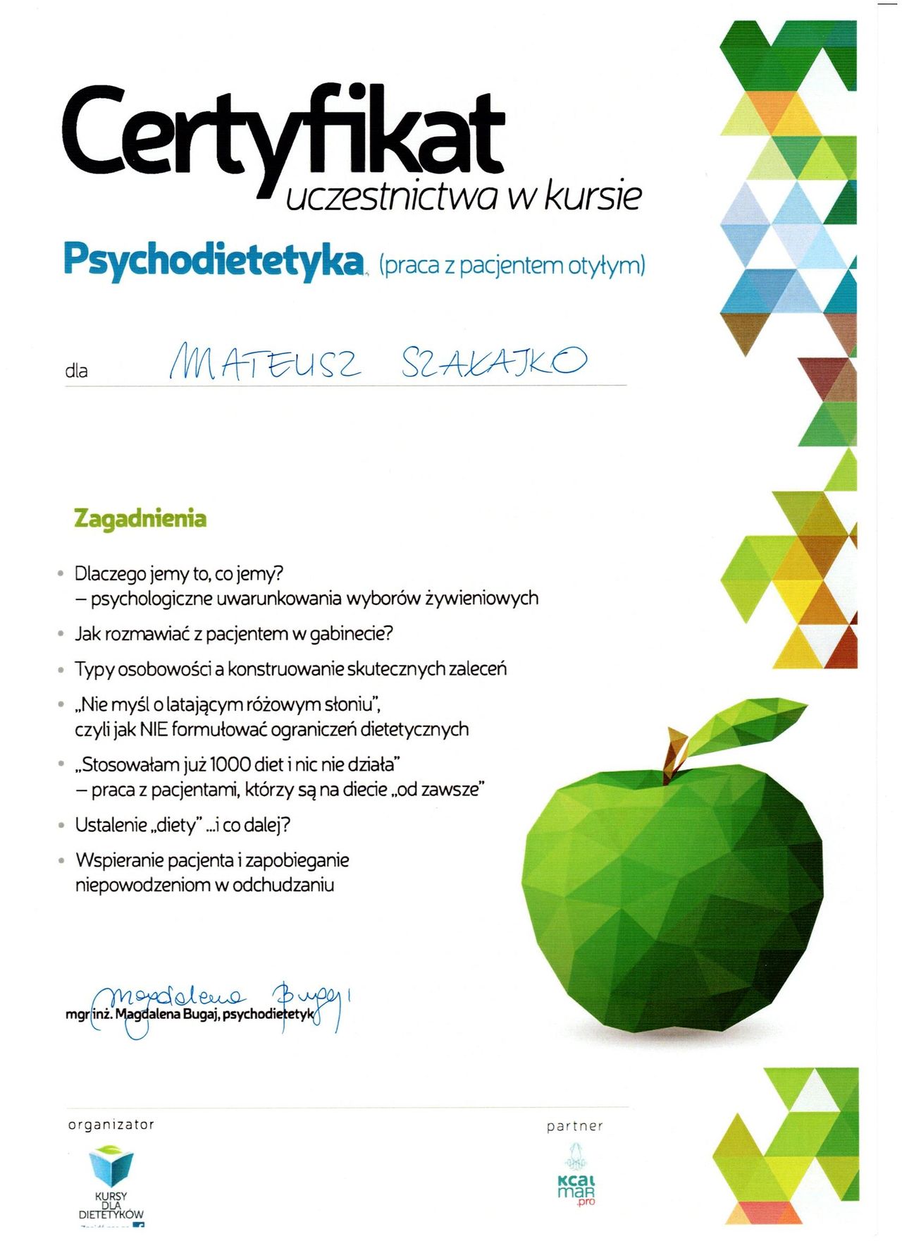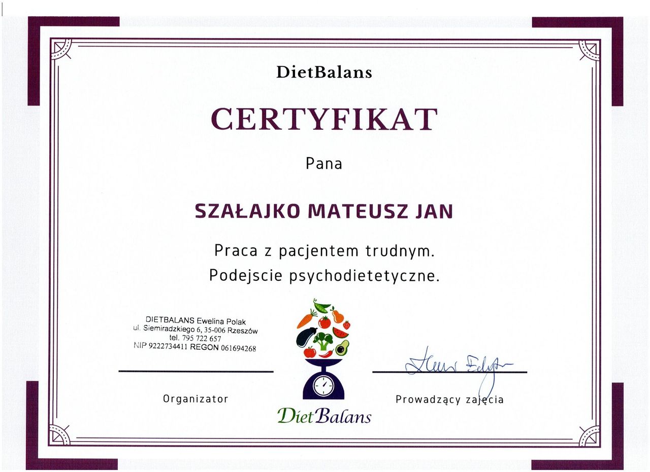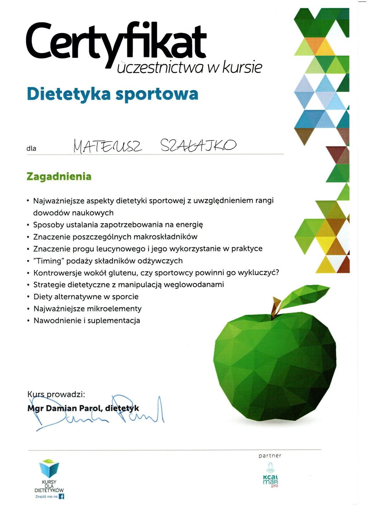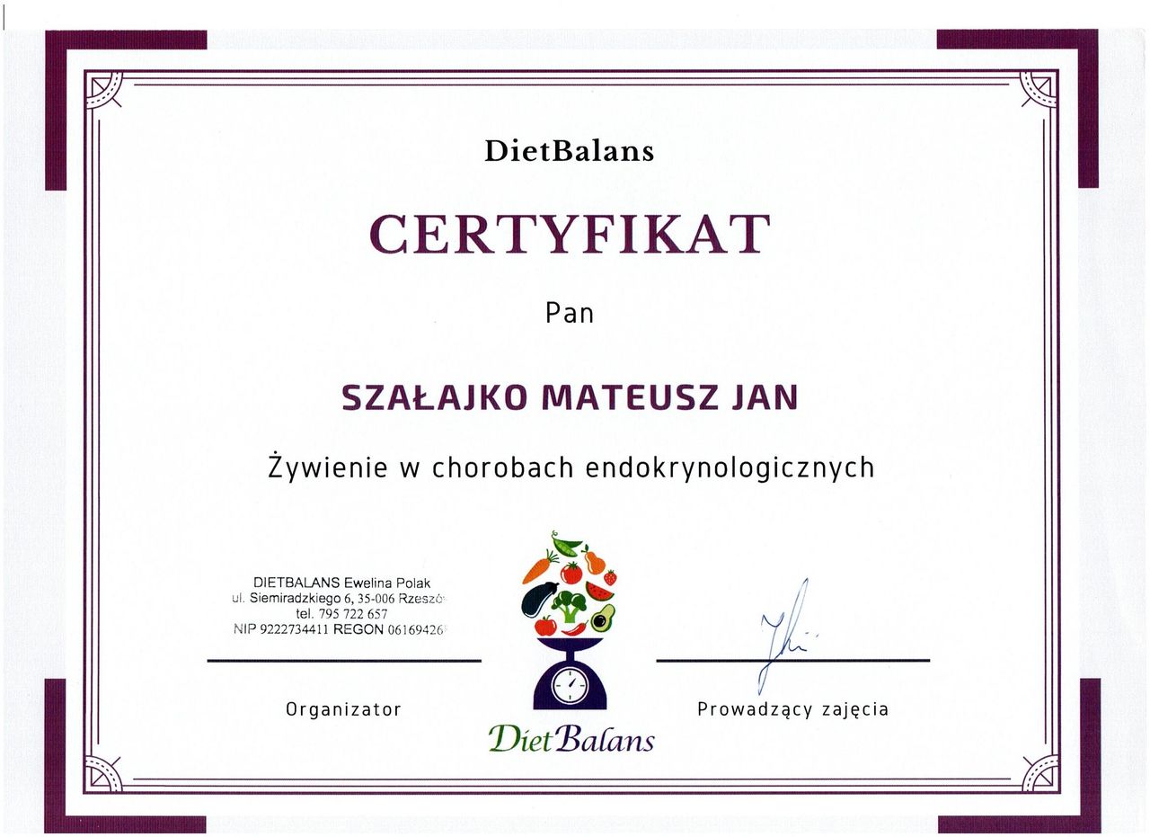 Jaki jest zakres porad oferowanych przez Mateusz Szałajko?Mateusz Szałajko to dietetyk. Na podstawie swojego doświadczenia i wykształcenia Mateusz Szałajko oferuje usługi takie jak: konsultacja online (pierwsza), konsultacja online (kontrolna).