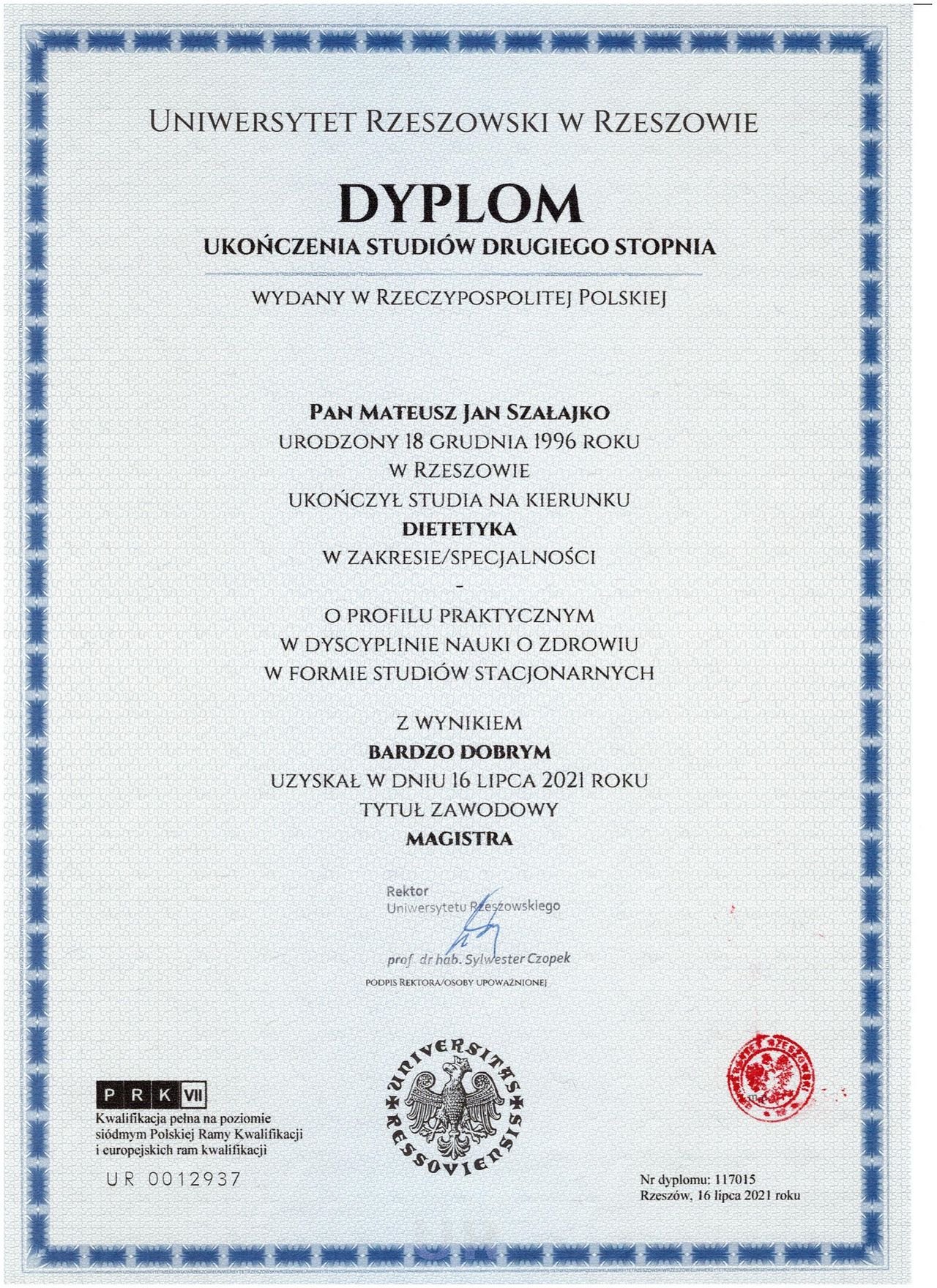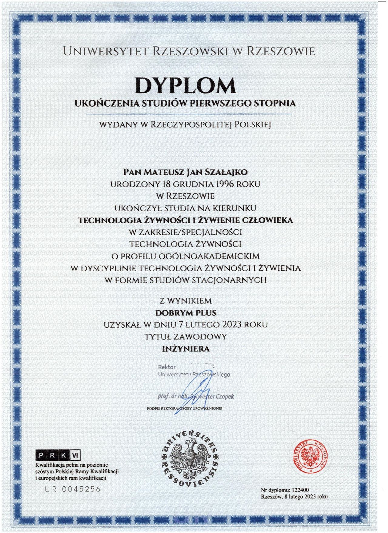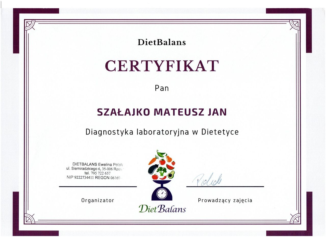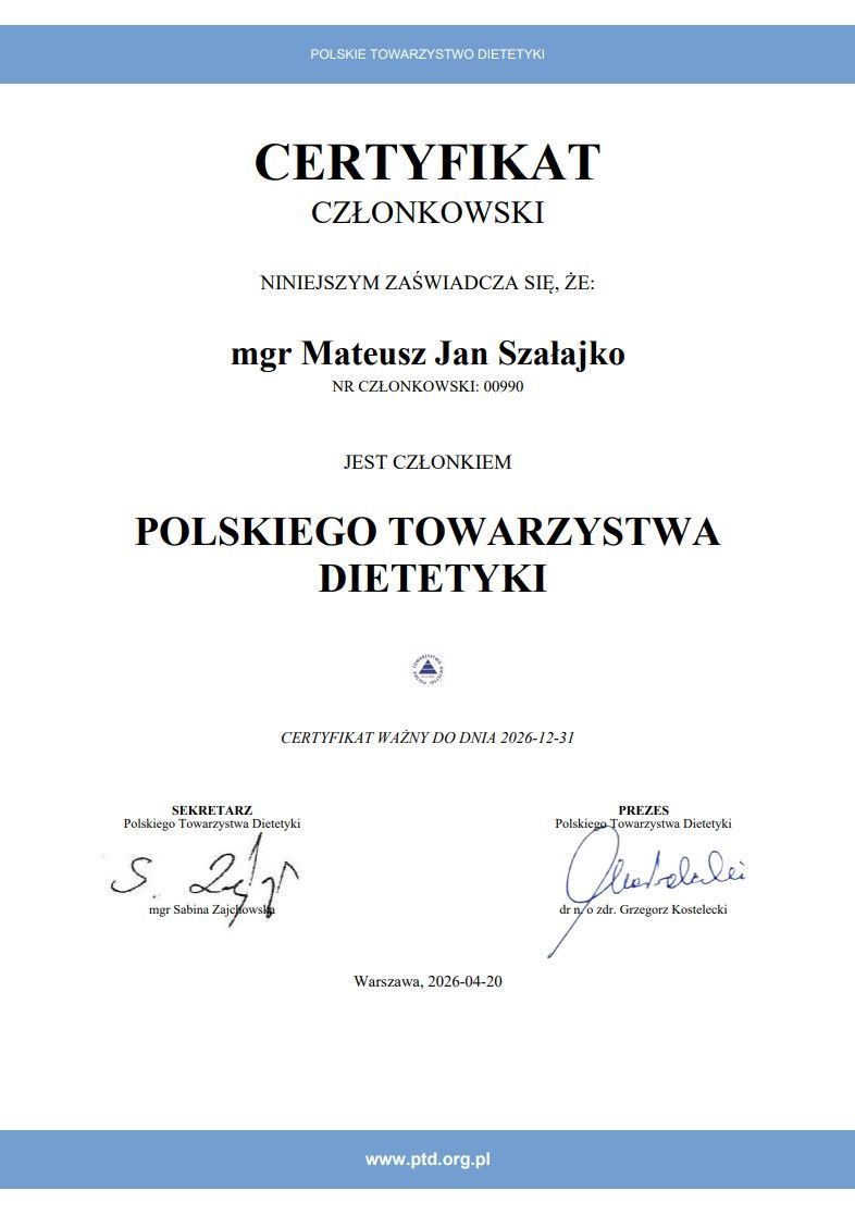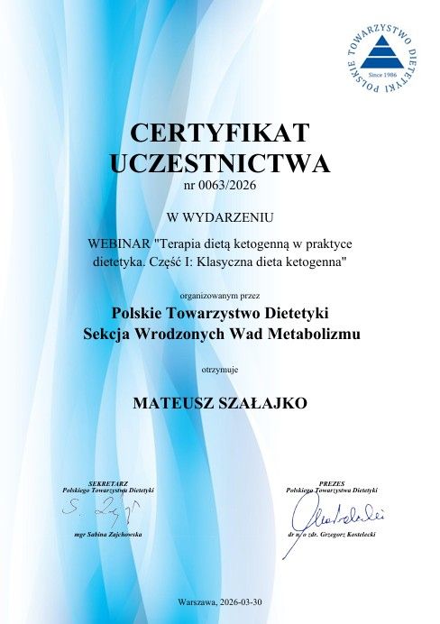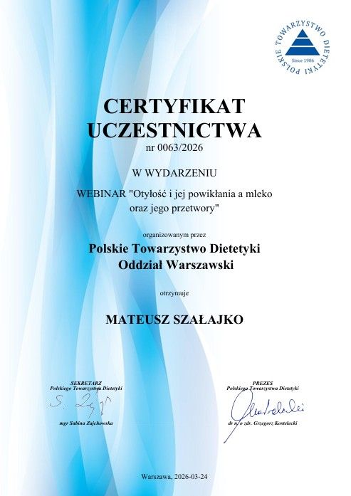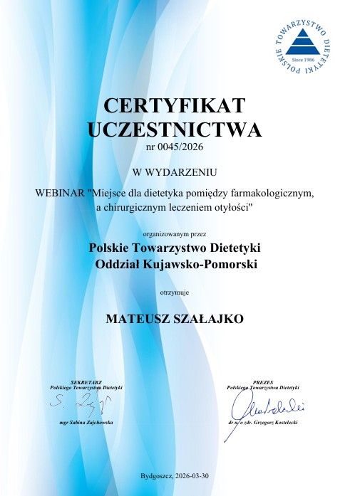 Jestem dietetykiem klinicznym, absolwentem dietetyki oraz technologii żywności. Obecnie realizuję doktorat w Instytucie Nauk o Żywieniu Człowieka SGGW w Warszawie, gdzie zajmuję się wpływem wysokoprzetworzonej diety na stan zapalny i zdrowie metaboliczne.