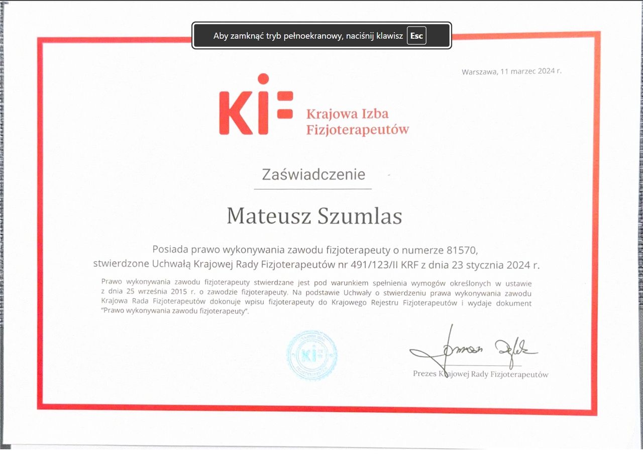 Jaki jest zakres porad oferowanych przez Mateusz Szumlas?Mateusz Szumlas to fizjoterapeuta. Na podstawie swojego doświadczenia i wykształcenia Mateusz Szumlas oferuje usługi takie jak: terapia mięśniowo-powięziowa, Terapia manualna, kinezyterapia, fizjoterapia, terapia psychosomatyczna, terapia w bólach głowy i migrenach, terapia wisceralna.