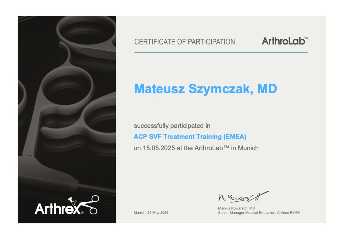 W leczeniu pacjentów stosuję zaawansowane metody medycyny regeneracyjnej, takie jak osocze bogatopłytkowe PRP oraz frakcję stromalno-naczyniową SVF. Dodatkowo oferuję zabiegi przy użyciu kwasów hialuronowych, preparatów kolagenu oraz klasycznych blokad sterydowych. Wybór metody leczenia jest zawsze indywidualnie dopasowywany do potrzeb pacjenta, zgodnie z jego schorzeniem oraz oczekiwaniami – „à la carte”.