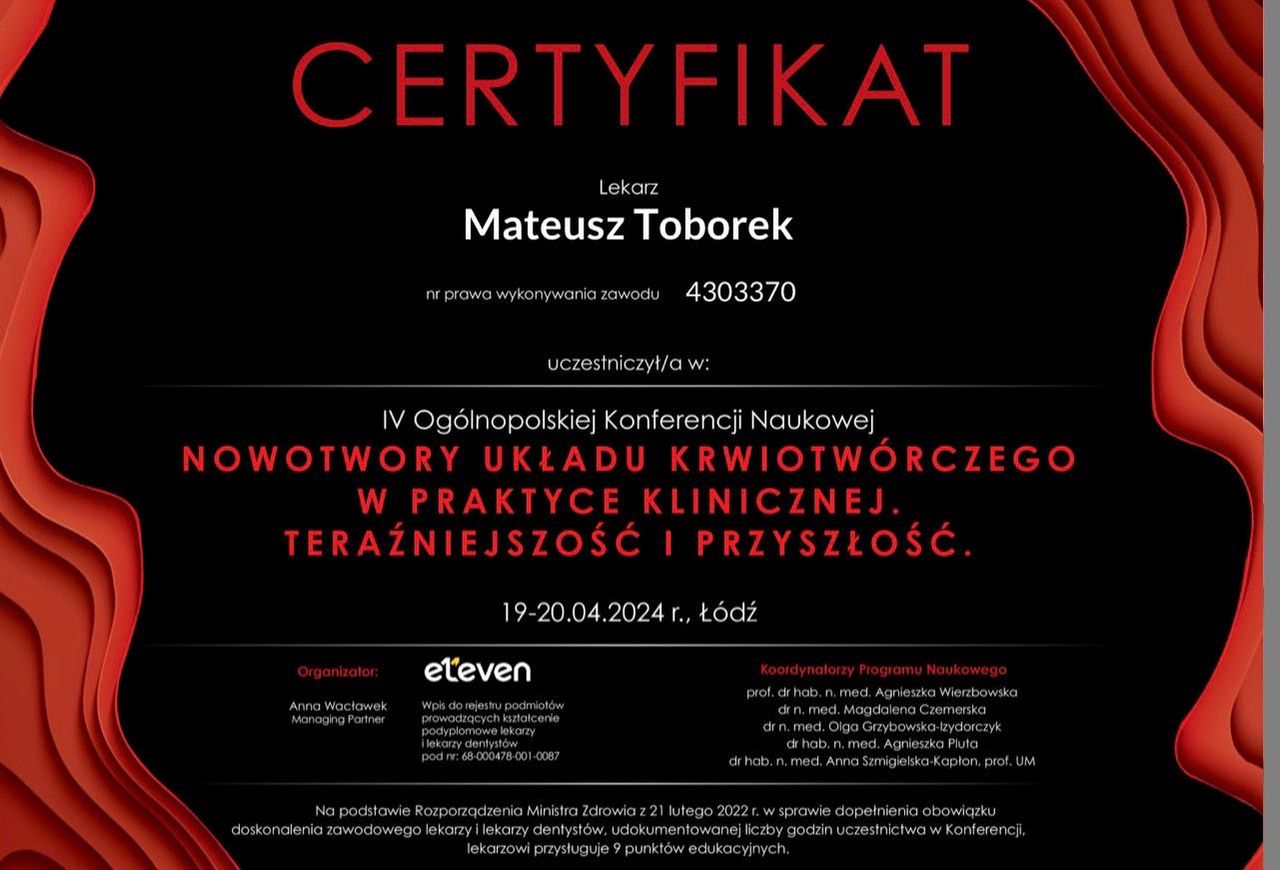 Jaki jest zakres porad oferowanych przez Mateusz Toborek?Mateusz Toborek to w trakcie specjalizacji (hematolog). Na podstawie swojego doświadczenia i wykształcenia Mateusz Toborek oferuje usługi takie jak: konsultacja hematologiczna, konsultacja hematologiczna kolejna.