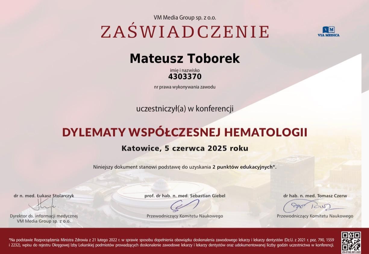 Absolwent Śląskiego Uniwersytetu Medycznego w Katowicach. Na co dzień pracuję w Klinice Hematologii i Transplantacji Szpiku Samodzielnego Publicznego Szpitala Klinicznego w Katowicach. W codziennej pracy moim głównym obszarem klinicznym jest hematoonkologia, m.in.: