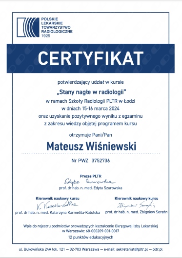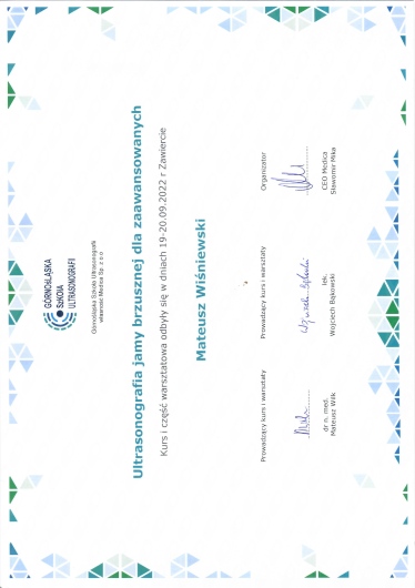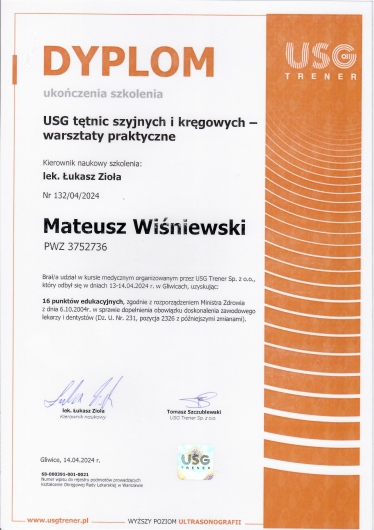Jaki jest zakres porad oferowanych przez Mateusz Wiśniewski?Mateusz Wiśniewski to w trakcie specjalizacji (radiolog). Na podstawie swojego doświadczenia i wykształcenia Mateusz Wiśniewski oferuje usługi takie jak: konsultacja radiologiczna, USG doppler kończyn dolnych - 2 nogi, USG jamy brzusznej, USG szyi (ocena ślinianek, tarczycy, węzłów chłonnych).
