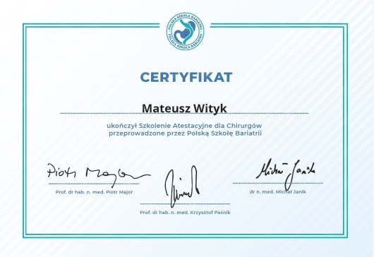 Jestem lekarzem, specjalistą Chirurgii Ogólnej i Chirurgii Onkologicznej. Szkolenie specjalizacyjne w zakresie Chirurgii Ogólnej ukończyłem z drugim, a z Chirurgii Onkologicznej z trzecim najlepszym wynikiem w kraju. Należę do licznych towarzystw naukowych, m.in. Europejskiego Towarzystwa Chirurgii Endoskopowej (EAES), International Bariatric Club, Towarzystwa Chirurgów Polskich (Sekcja Chirurgii Metabolicznej i Bariatrycznej, Sekcja Wideochirurgii, Sekcja Endoskopowa), International Society for Fluorescence Guided Surgery. Obecnie pracuję jako asystent w Oddziale Chirurgii Ogólnej i Onkologicznej Regionalnego Centrum Zdrowia w Lubinie. Uczestniczyłem w licznych szkoleniach i stażach krajowych oraz zagranicznych, m.in. w klinikach w Strasburgu, Oslo, Brugii, Wiedniu, Madrycie, Angers, Kapsztadzie, Malmo, Roterdamie. Byłem wykładowca na kursach i szkoleniach krajowych oraz zagranicznych; swoje prace prezentował m.in. na zjazdach Europejskiego Towarzystwa Chirurgii Endoskopowej. Organizuję zaawansowane kursy w zakresie chirurgii metabolicznej, bariatrycznej i rewizyjnej dla Chirurgów z Polski. Główne zainteresowanie: Chirurgia minimalnie inwazyjna nowotworów przewodu pokarmowego. Chirurgia metaboliczna i bariatryczna - chirurgiczne leczenie otyłości. Zakres operacyjny: laparoskopowe operacje raka jelita grubego, trzustki, żołądka, wątroby i dróg żółciowych.SADI-S; Wyłączenie żołądkowo-jelitowe z jednym zespoleniem - "mini" gastric bypass (OAGB); Wyłączenie żołądkowo-jelitowe sposobem Roux-en-Y - gastric bypass (RYGB); Duodenal switch; Operacje rewizyjne i konwersyjne po chirurgicznym leczeniu otyłości; Rękawowa resekcja żołądka. Cholecystektomia laparoskopowa. Laparoskopowe operacje przepuklin pachwinowych i brzusznych.
