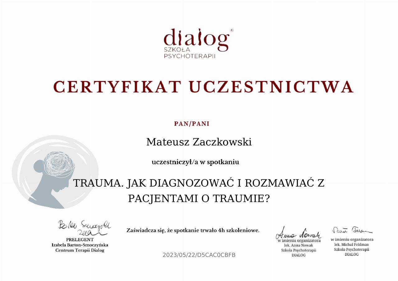 Byłam w wielu terapiach, ze względu na chorobę natomiast Pan Mateusz jako jedyny terapeuta wychwycił ten główny problem który zapanował nam moim życiem. Od wejścia do gabinetu można odczuć poczucie bezpieczeństwa i od razu pojawia się zaufanie. Na pewno warto udać się do Pana Mateusza