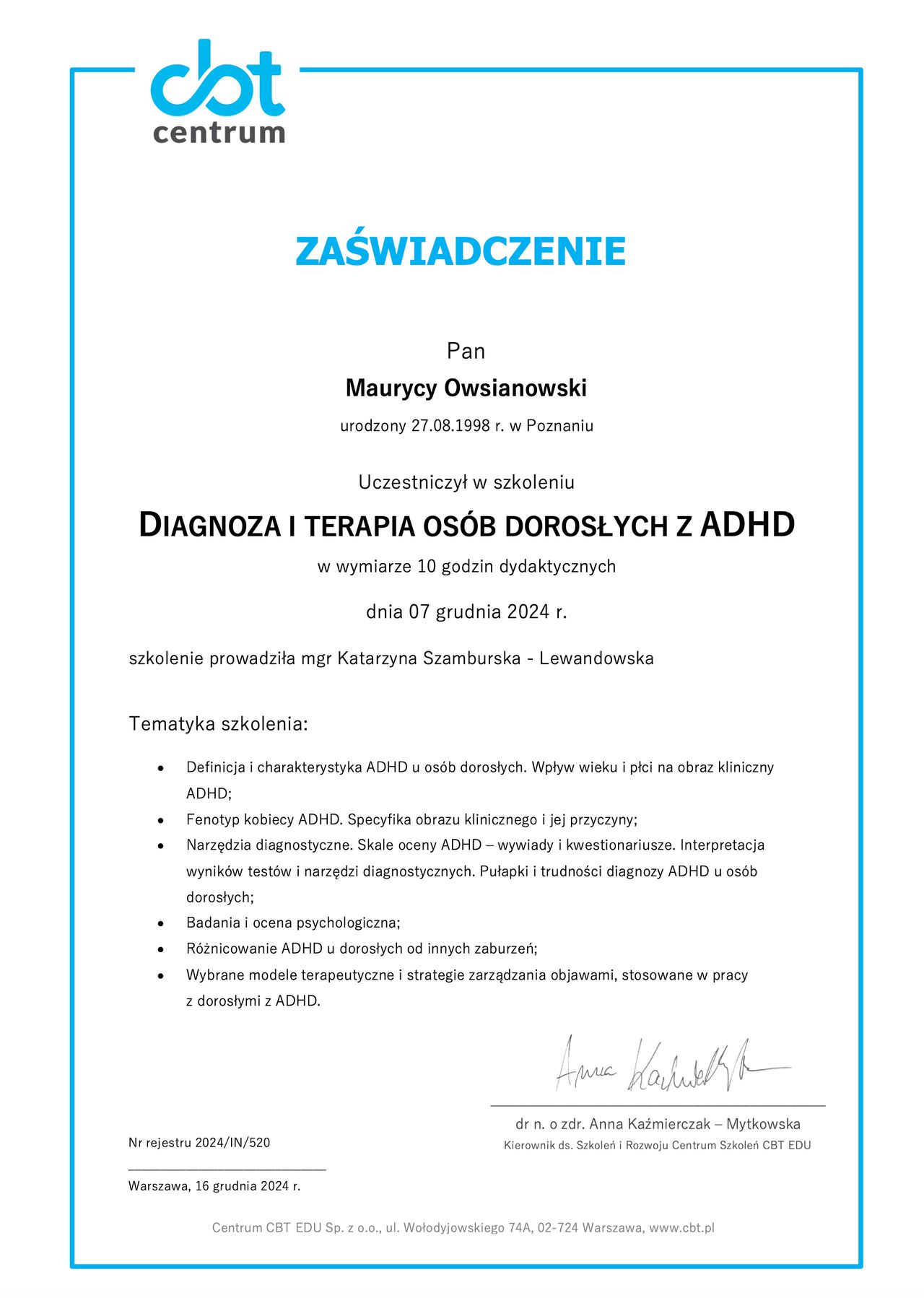 Do wizyty u neuropsychologa podchodziłem z pewną rezerwą, ale już po pierwszych minutach rozmowy z Panem Maurycym wiedziałem, że trafiłem w odpowiednie miejsce. Ogromny profesjonalizm połączony z empatią i spokojem sprawił, że naprawdę czułem się bezpiecznie i w pełni wysłuchany. Badanie było przeprowadzone bardzo rzetelnie, a jednocześnie w atmosferze, która sprzyjała otwartości i zaufaniu. Każdy etap został dokładnie wyjaśniony, co pozwoliło mi lepiej zrozumieć cały proces. Szczególnie doceniam poczucie odpowiedzialności za pacjenta i indywidualne podejście. Miałem wrażenie, że naprawdę liczy się tu człowiek, a nie tylko „przypadek medyczny”. To specjalista, którego z pełnym przekonaniem mogę polecić każdemu, kto szuka fachowej i ludzkiej pomocy.