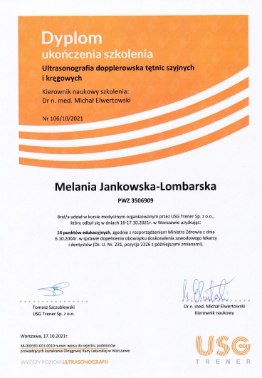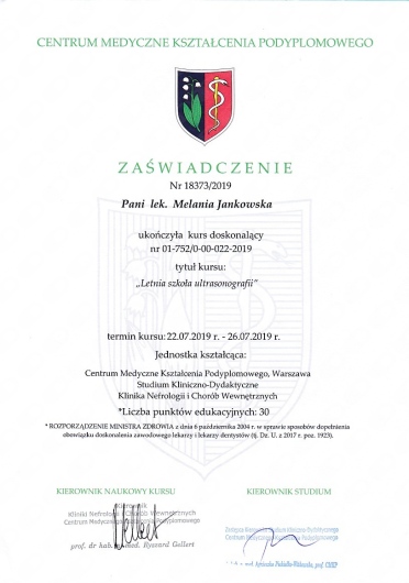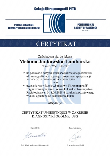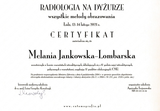 Stale podnoszę swoje kwalifikacje i umiejętności uczestnicząc w kursach. Jestem członkiem Polskiego Towarzystwa Radiologicznego oraz European Society of Radiology.