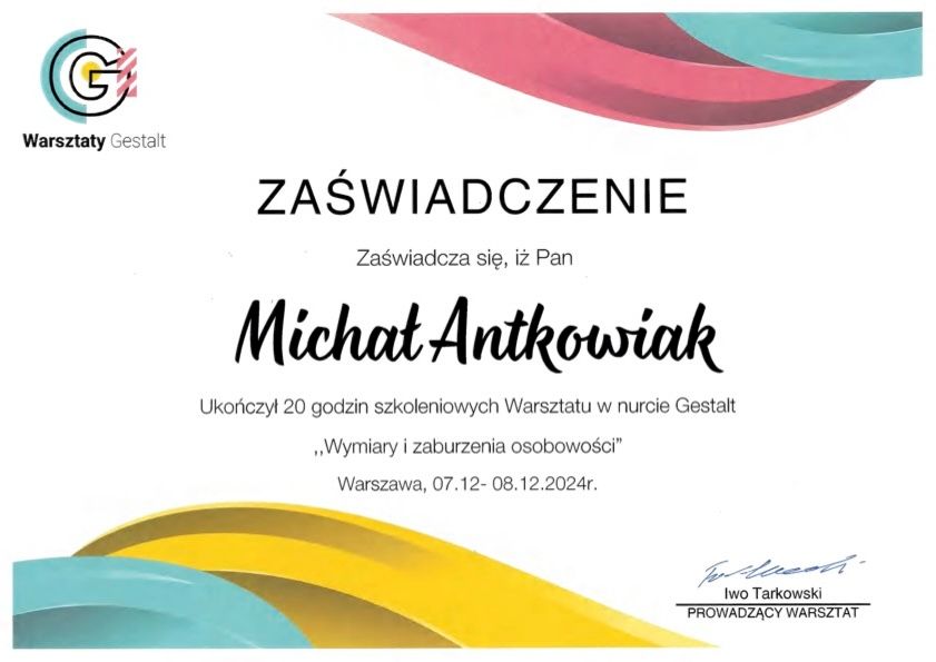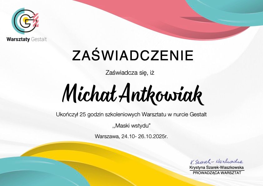 Swoje kompetencje terapeutyczne rozwijam poprzez udział w licznych szkoleniach i warsztatach specjalistycznych, w tym w Instytucie Integralnej Psychoterapii Gestalt. Ukończyłem m.in. szkolenia dotyczące zaburzeń osobowości, pracy ze wstydem („Maski wstydu”) oraz Szkołę Zimową Gestalt, koncentrującą się na pogłębianiu relacji terapeutycznej i pracy w kontakcie.
