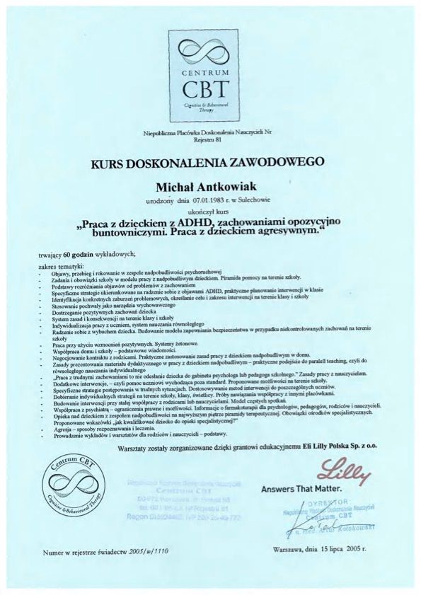 Posiadam również przygotowanie do pracy z dziećmi i młodzieżą z ADHD oraz zachowaniami opozycyjno-buntowniczymi i agresywnymi, zdobyte w ramach kursu doskonalenia zawodowego realizowanego w podejściu poznawczo-behawioralnym (CBT).