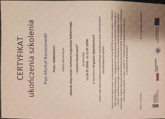 Posiadam solidne wykształcenie zdobyte podczas studiów na renomowanej uczelni, oraz podczas wielu kursów specjalistycznych. co pozwoliło mi na zdobycie wiedzy i umiejętności niezbędnych do profesjonalnego zajmowania się pacjentami w gabinecie prywatnym jak i na oddziale Ortopedii i Rehabilitacji w SPSK nr 4 w Lublinie. Moja praktyka obejmuje szeroki zakres działa: