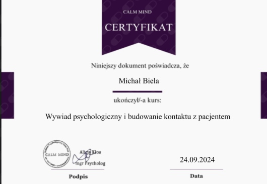 Serdecznie polecam współpracę z Panem Michałem. Jest świetnym terapeutą, który z pełnym zaangażowaniem i profesjonalizmem podszedł do moich problemów. Jest bardzo empatyczny, posiada