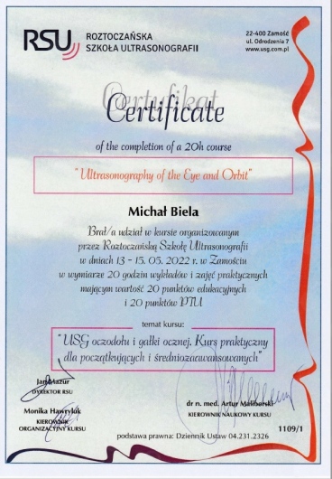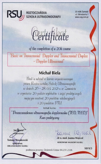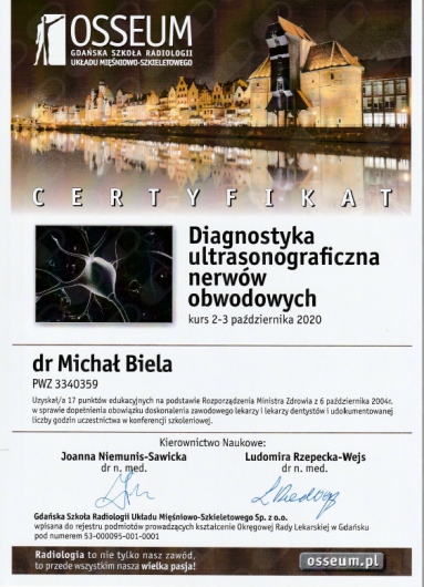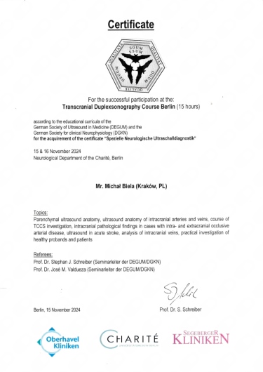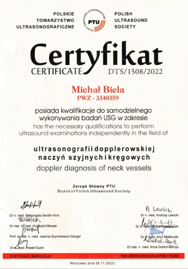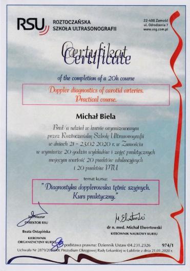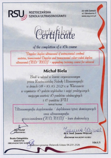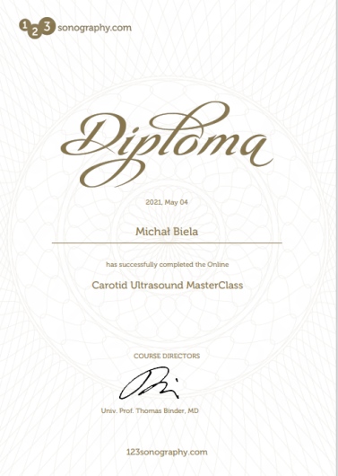 Moją szczególną pasją jest ultrasonografia. Wykonuje USG doppler tętnic szyjnych i kręgowych, USG doppler tętnic wewnątrzczaszkowych, USG tętnic skroniowych - diagnostyka olbrzymiokomórkowego zapalenia tętnic ( zapalenie tętnicy skroniowej) oraz zbieram doświadczenie w wykonywaniu USG nerwów obwodowych.