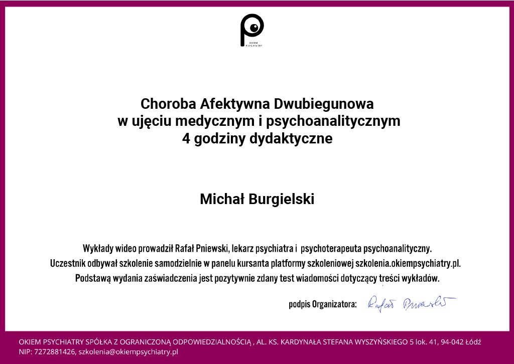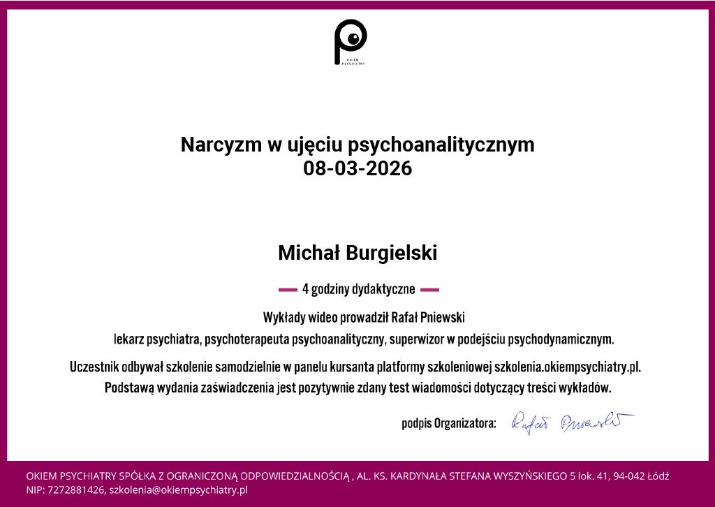 Ukończyłem 4 letnie podyplomowe całościowe szkolenie z psychoterapii w Krakowskim Centrum Psychodynamicznym uprawniające do prowadzenia psychoterapii pod superwizją, atestowane przez Polskie Towarzystwo Psychologiczne, Polskie Towarzystwo Psychiatryczne i Polskie Stowarzyszenie Psychoterapii Psychodynamicznej.