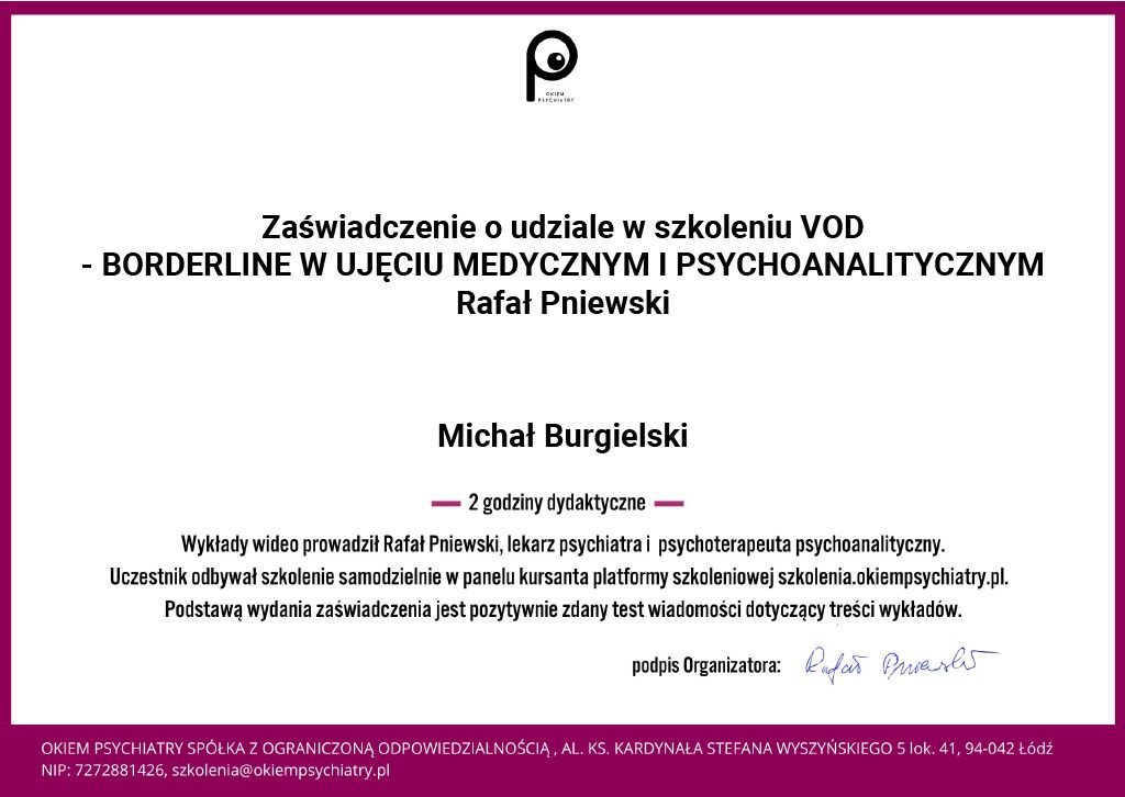 Swoją pracę superwizuję u certyfikowanego psychoterapeuty Polskiego Towarzystwa Psychiatrycznego.
