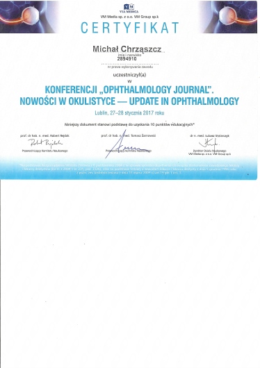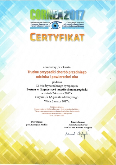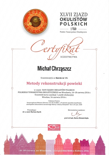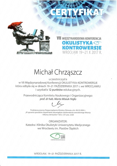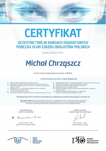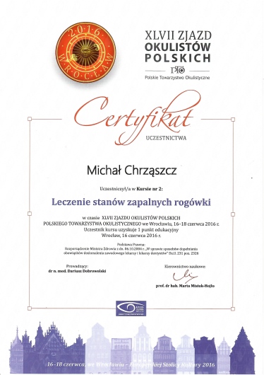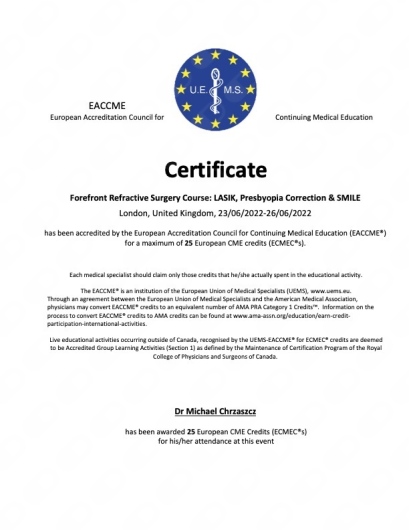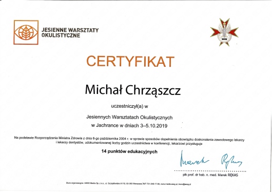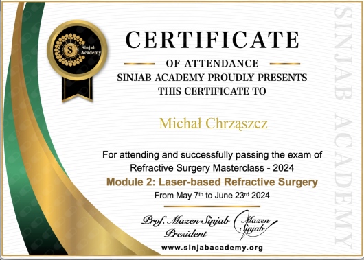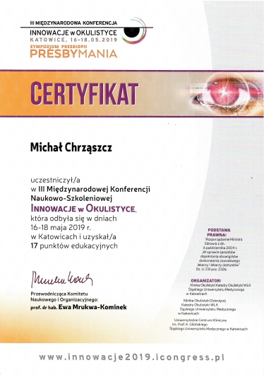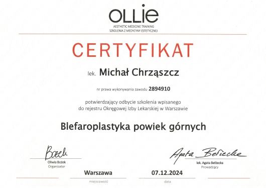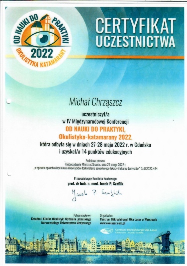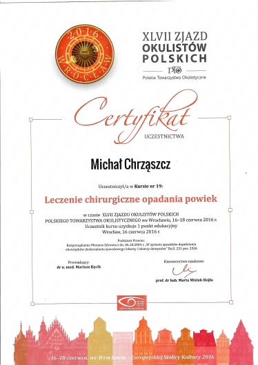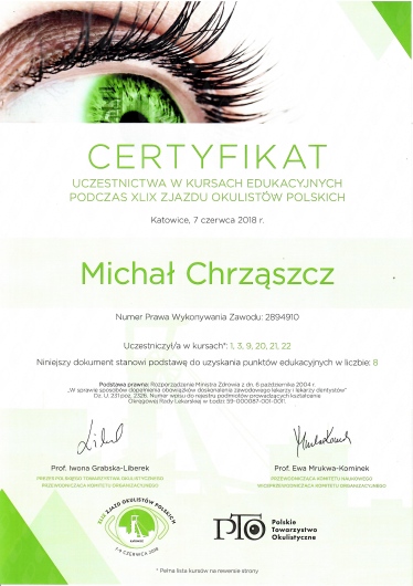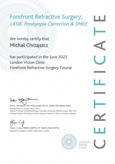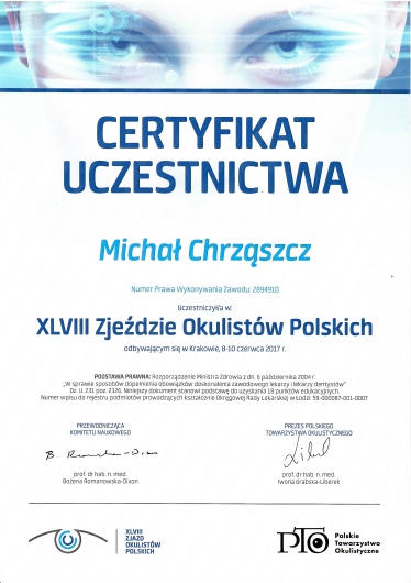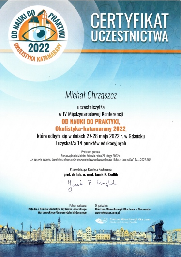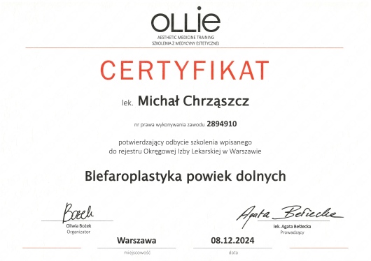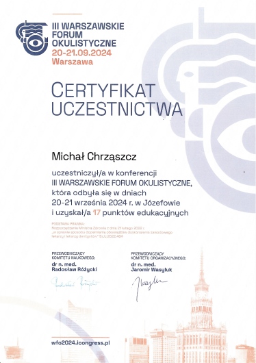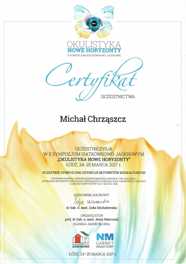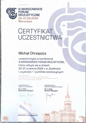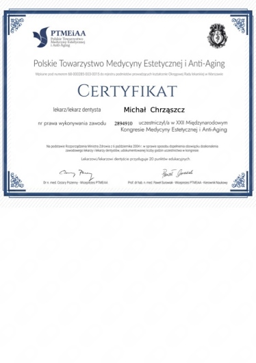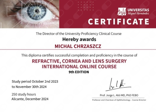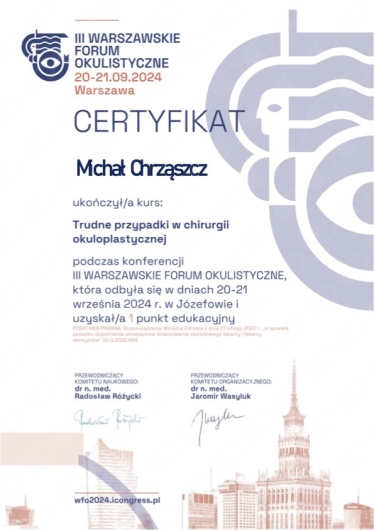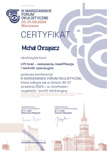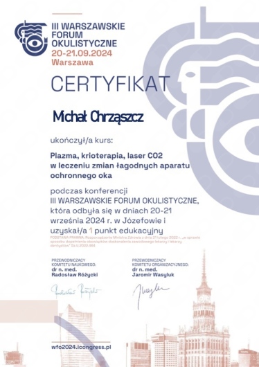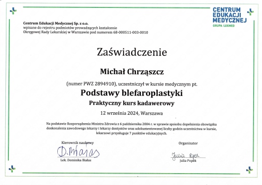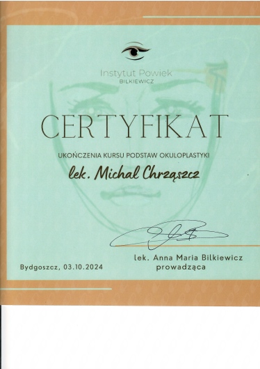 Uważając, że medycyna estetyczna stanowi naturalne uzupełnienie mojej specjalizacji – szczególnie w tak ważnej i delikatnej okolicy oka – w 2024r. podjąłem również studia podyplomowe z zakresu medycyny estetycznej. Wierzę, że zapewnienie kompleksowej opieki, łączącej zarówno aspekty zdrowotne i estetyczne pozwala mi lepiej sprostać oczekiwaniom moich pacjentów.
