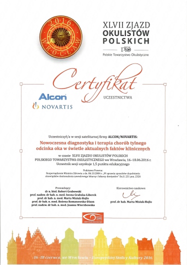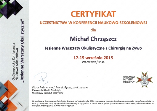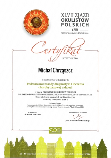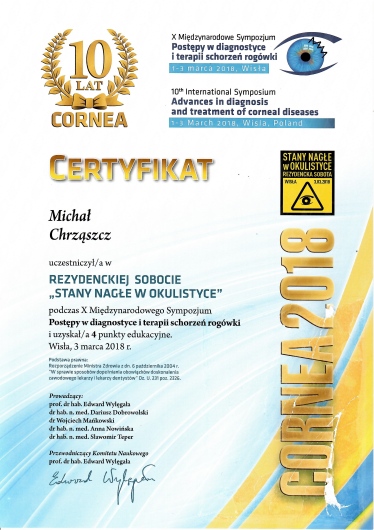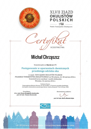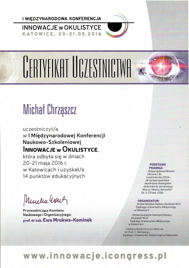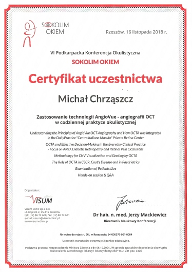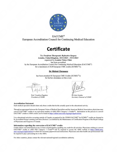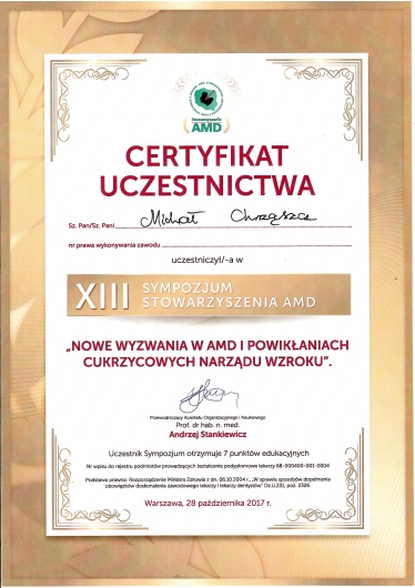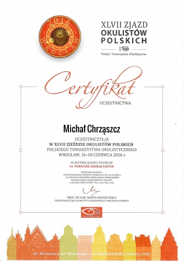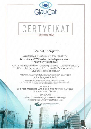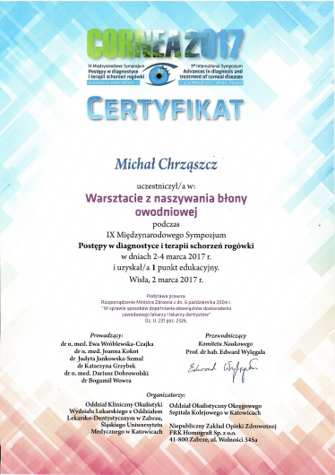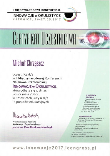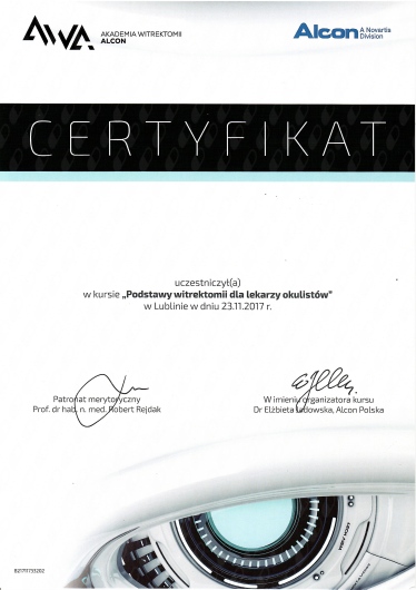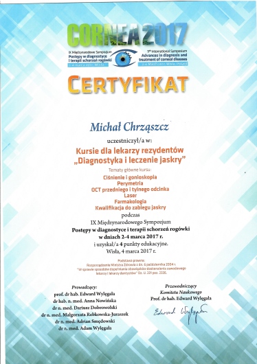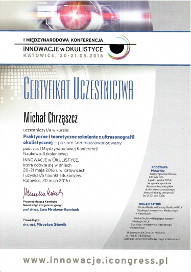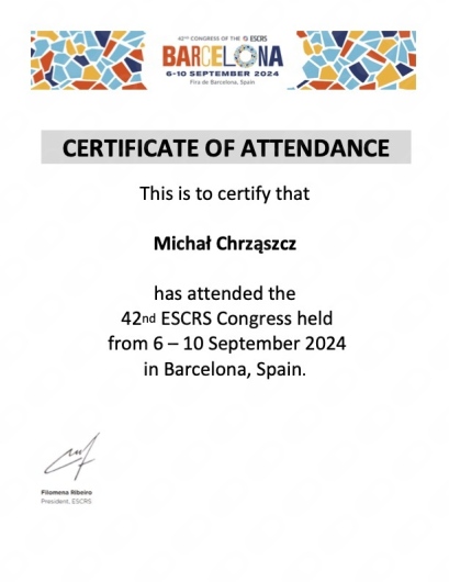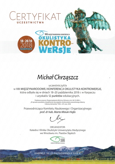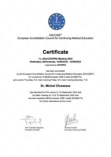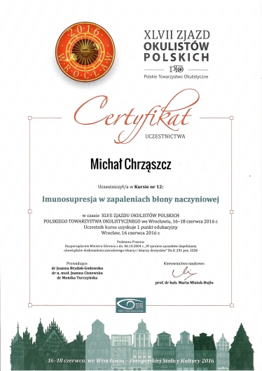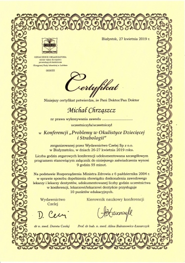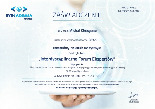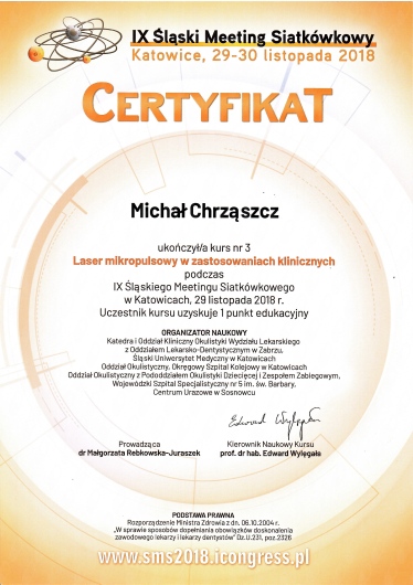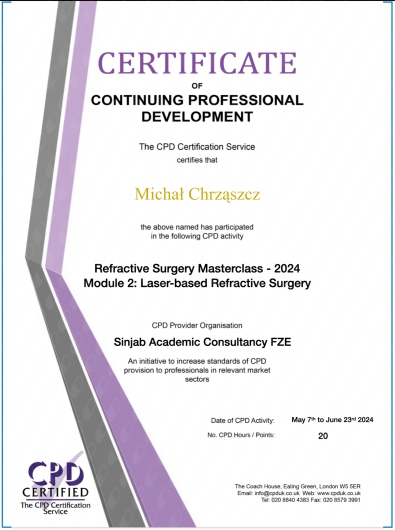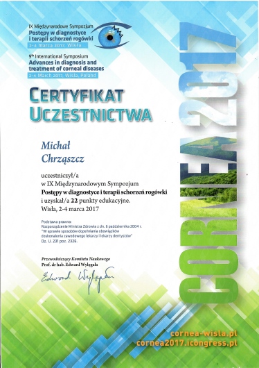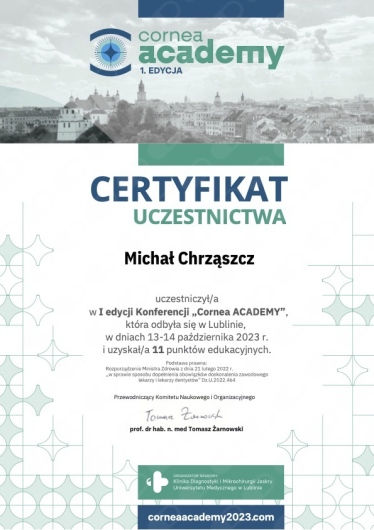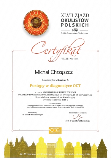 Uważając, że medycyna estetyczna stanowi naturalne uzupełnienie mojej specjalizacji – szczególnie w tak ważnej i delikatnej okolicy oka – w 2024r. podjąłem również studia podyplomowe z zakresu medycyny estetycznej. Wierzę, że zapewnienie kompleksowej opieki, łączącej zarówno aspekty zdrowotne i estetyczne pozwala mi lepiej sprostać oczekiwaniom moich pacjentów.
