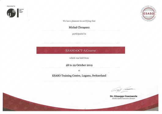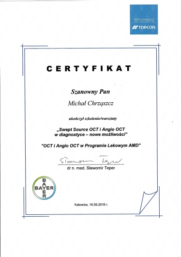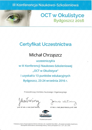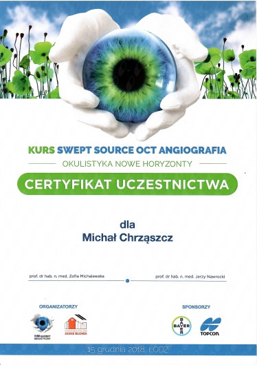 Dzięki temu gruntownemu przygotowaniu, w swojej pracy zajmuję się kompleksową diagnostyką i leczeniem schorzeń powiek, przedniego i tylnego odcinka oka, w tym chorób rogówki, zaćmy, jaskry, a także schorzeń siatkówki, ciała szklistego i nerwu wzrokowego. Moje zainteresowanie nowoczesnymi metodami diagnostycznymi w chorobach siatkówki, takimi jak swept source OCT oraz angio-OCT, ale i wykorzystanie nowoczesnych laserów w okulistyce pozwalają mi świadczyć usługi w oparciu o najnowsze i najbardziej zaawansowane osiągnięcia technologiczne w okulistyce.