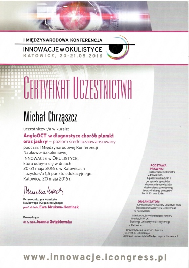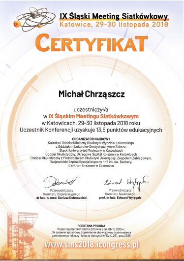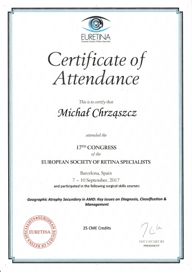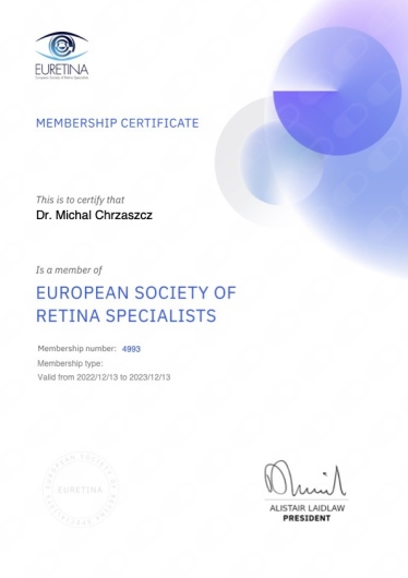 Poza działalnością kliniczną i leczniczą, aktywnie rozwijam się także w obszarze naukowym. Przez wiele lat byłem nauczycielem akademickim, a obecnie w ramach trwającego przewodu doktorskiego, badam patogenezę centralnej surowiczej chorioretinopatii. Moja dorobek naukowy obejmuje liczne publikacje oraz wystąpienia na krajowych i międzynarodowych konferencjach. Jestem członkiem Polskiego Towarzystwa Okulistycznego, Europejskiego Stowarzyszenia Specjalistów Chorób Siatkówki EuRETINA, Europejskiego Stowarzyszenia Chirurgów Refrakcyjnych i Zaćmy (ESCRS) oraz Europejskiego Towarzystwa Chirurgii Okuloplastycznej i Rekonstrukcyjnej (ESOPRS).