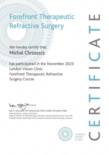 Od początku mojej pracy szczególnie interesuje mnie chirurgia refrakcyjna – laserowa korekcja wad wzroku – oraz chirurgia okuloplastyczna, w tym usuwanie zmian powiekowych, korekcja ich nieprawidłowego ustawienia i blefaroplastyka – chirurgia plastyczna powiek. Zainteresowanie te staram się nieprzerwanie rozwijać uczestnicząc w licznych certyfikowanych kursach doszkalających, stażach i sympozjach – w tym w London Vision Clinic, Universitas Miguel Hernandez w Alicante oraz European School for Advance Studies in Ophthalmology w Lugano i Swiss Academy of Cosmetic Dermatology and Aesthetic Medicine.