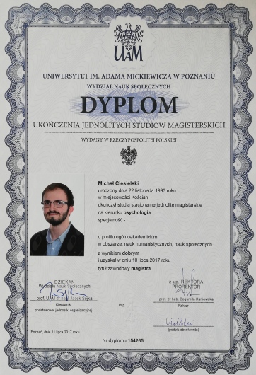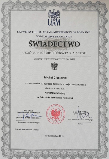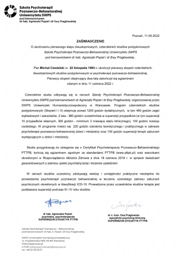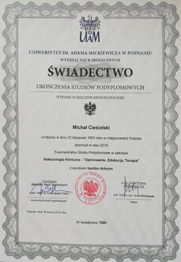 Jestem psychologiem, seksuologiem dyplomowanym, psychoterapeutą poznawczo-behawioralnym w trakcie certyfikacji (4 rok). Prowadzę sesje psychoterapii indywidualnej w formie online z osobami dorosłymi. Udzielam również konsultacji i porad w zakresie szeroko rozumianego zdrowia psychicznego i seksualności człowieka. Jeszcze na studiach doświadczenie zdobywałem w ramach stażu w Wojewódzkim Szpitalu Neuropsychatrycznym w Kościanie, a od 2017 roku w Pracowni Psychologiczno - Seksuologicznej w Poznaniu, Poradniach Zdrowia Psychicznego w Poznaniu oraz w ramach prywatnej praktyki online. Od 2019 pracuję w Gabinetach Lekarskich Medicor w Poznaniu w ramach Narodowego Funduszu Zdrowia, a od 2022 prowadzę też prywatny gabinet w formie zdalnej. Swoją pracę poddaję regularnej superwizji.