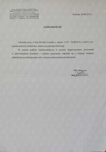 Pan Michał jest naprawdę wspaniałą osobą dzięki której udało mi się przezwyciężyć swoje problemy. Po każdej wizycie czułam się lepiej. Jestem wdzięczna za to że trafiłam na tak dobrego psychologa. Zaangażowanie w swoją pracę to wielka zaleta. W trakcie wizyty można było odczuć pozytywny nastrój oraz indywidualne podejście. Pan Ciesielski jest odpowiednią osobą na odpowiednim stanowisku.