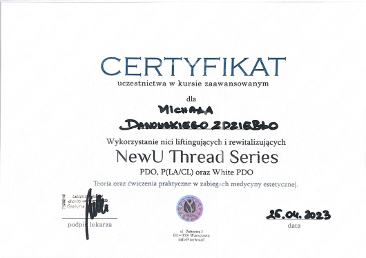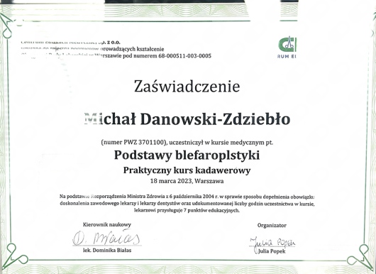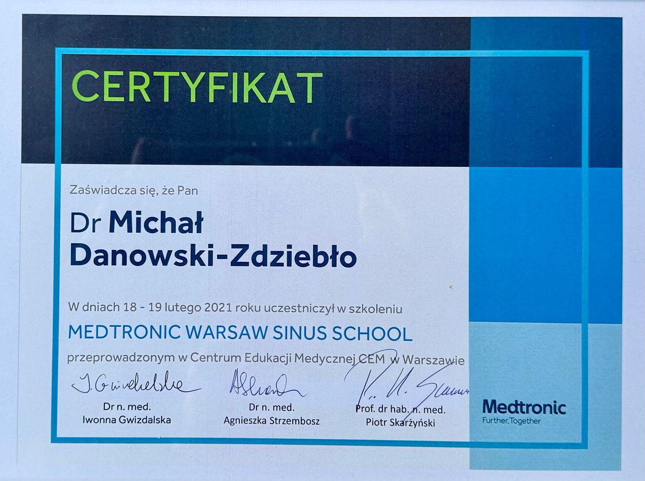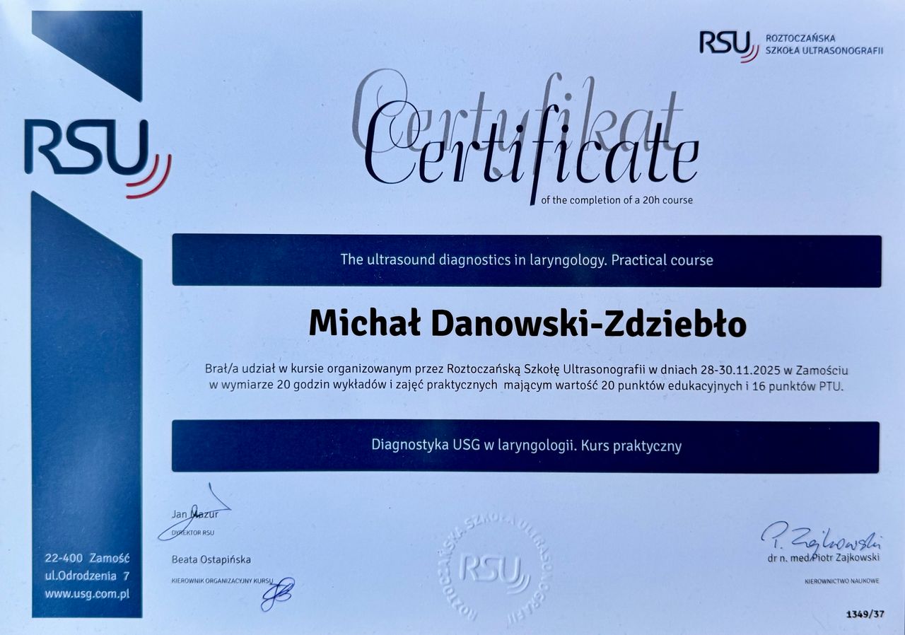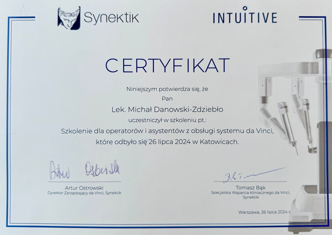 Jestem jednym z siedmiu w Polsce certyfikowanych operatorów systemu robotycznego da Vinci do przeprowadzania zabiegów w obrębie głowy i szyi. Ukończyłem szkolenie w Roztoczańskiej Szkole Ultrasonografii uzyskując certyfikat diagnostyki USG w Laryngologii.