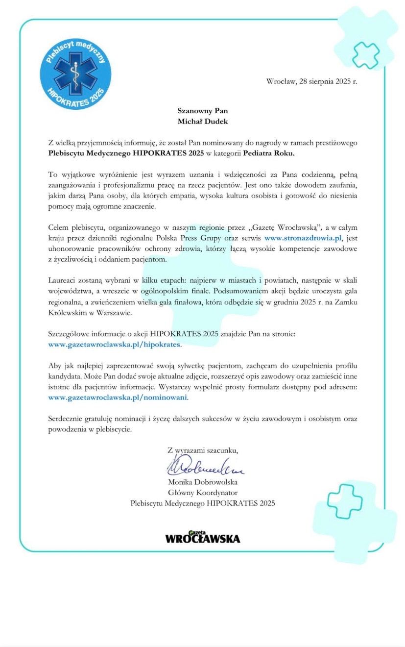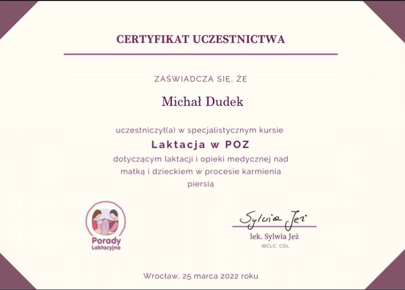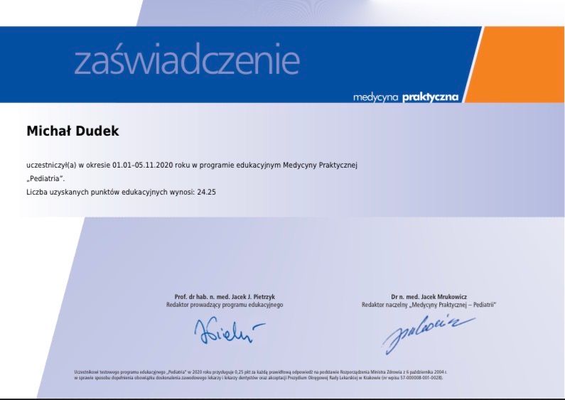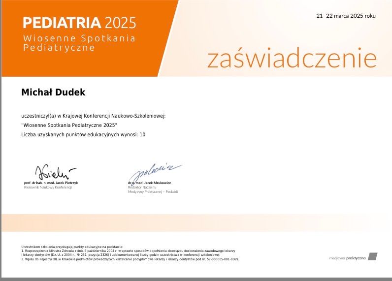 Specjalista pediatrii z zamiłowaniem do ultrasonografii. Członek Polskiego Towarzystwa Wakcynologicznego i Polskiego Towarzystwa Konsultantów i Doradców Laktacyjnych. Ukończyłem Wydział Lekarski Uniwersytetu Medycznego im. Piastów Śląskich we Wrocławiu. Staż podyplomowy odbyłem w Wojewódzkim Szpitalu Zespolonym im. Ludwika Perzyny w Kaliszu. Szkolenie specjalizacyjne zakończyłem w Oddziale Pediatrii Ogólnej i Immunologii Klinicznej Wojewódzkiego Szpitala Specjalistycznego im. J. Gromkowskiego we Wrocławiu.