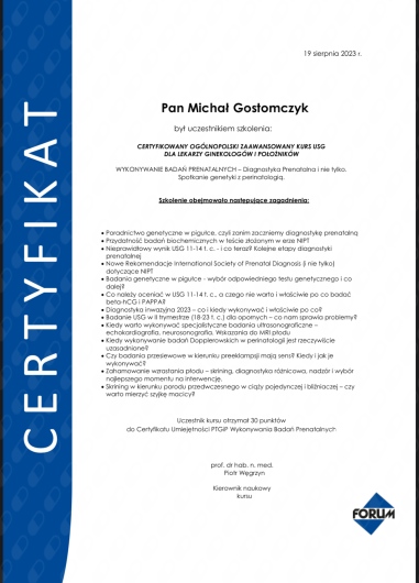 Przez całe 9 miesięcy skrupulatnie chodziłam do Pana Michała na wizytę, za każdym razem spotkałam się z bardzo dużym profesjonalizmem. Doktor wszystko tłumaczył, uspakajał w razie stresujących dla mnie sytuacji. Był z nim stały kontakt, odpisywał na wiadomości, zadawał pytania, dopytywał. Czułam się bardzo zaopiekowana i spokojna co jest niesamowicie ważne w okresie ciąży.