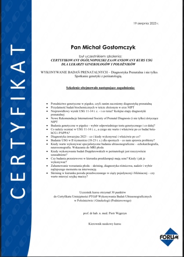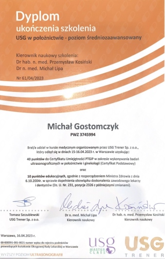 Jaki jest zakres porad oferowanych przez Michał Gostomczyk?Michał Gostomczyk to w trakcie specjalizacji (ginekolog). Na podstawie swojego doświadczenia i wykształcenia Michał Gostomczyk oferuje usługi takie jak: konsultacja ginekologiczna, USG ginekologiczne, badania diagnostyczne, kwalifikacja do operacji, cytologia, prowadzenie ciąży, Antykoncepcja, konsultacja położnicza, farmakoterapia, USG.