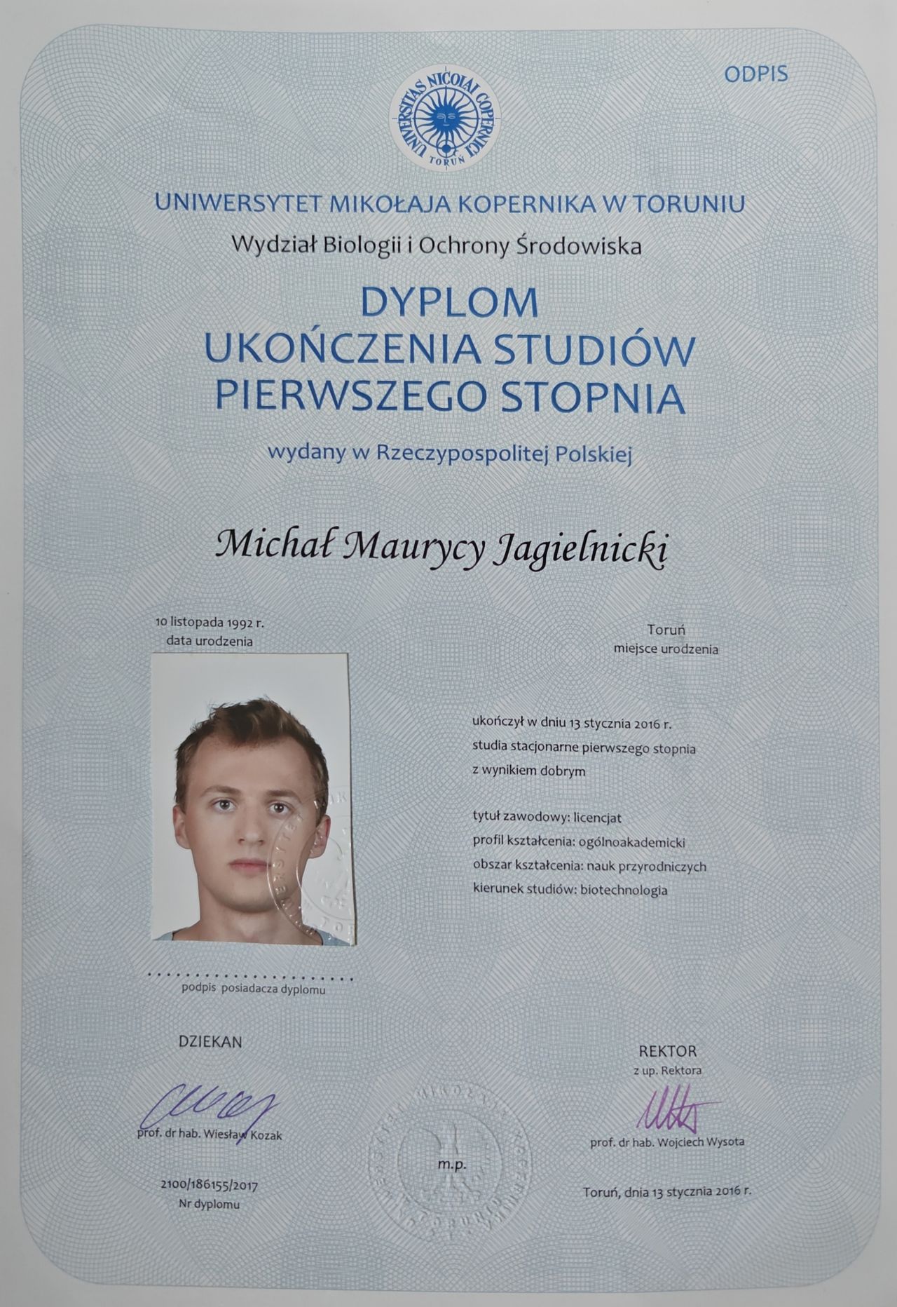 • Licencjat biotechnologii – Uniwersytet Mikołaja Kopernika w Toruniu