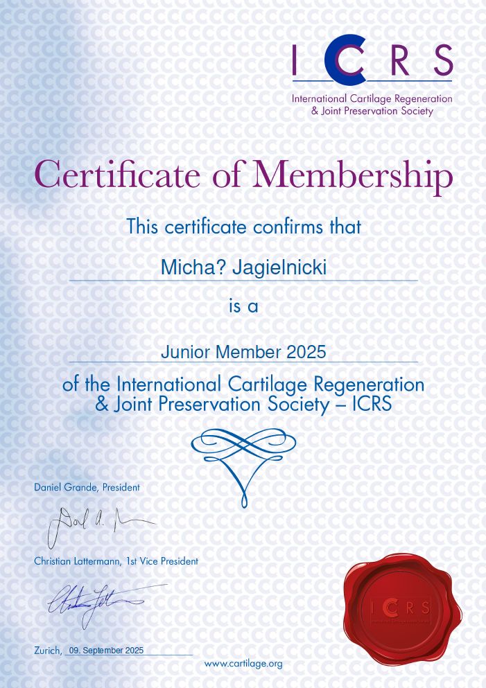 • Członek ICRS – International Cartilage Regeneration & Joint Preservation Society