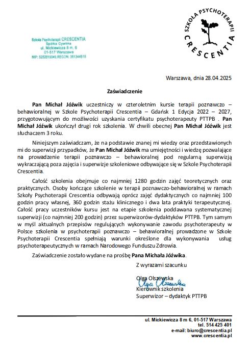 Zgłosiłam się w punkcie krytycznym, z poczuciem beznadziei i wiecznym płaczem. Konflikty z bliskimi, brak energii do pracy, stres i strach. Relacje były coraz gorsze z mężem i córkami. Już od pierwszego spotkania Pan Michał Jóźwik wykazał się wyjątkową empatią i prawdziwą cierpliwością. Nigdy nie pospiesza, poświęcając mi cały potrzebny czas. Jasno wytłumaczył mi plan terapii, w ramach którego cyklicznie omawiamy i rozbrajamy kolejne blokady i problemy. W moim przypadku terapia jest niesamowicie efektywna. Pan Michał jest zawsze punktualny. Wiem, że w kryzysowej sytuacji zawsze mogę na Niego liczyć, co jest bezcenne. Gorąco polecam psychoterapeutę Michała :)