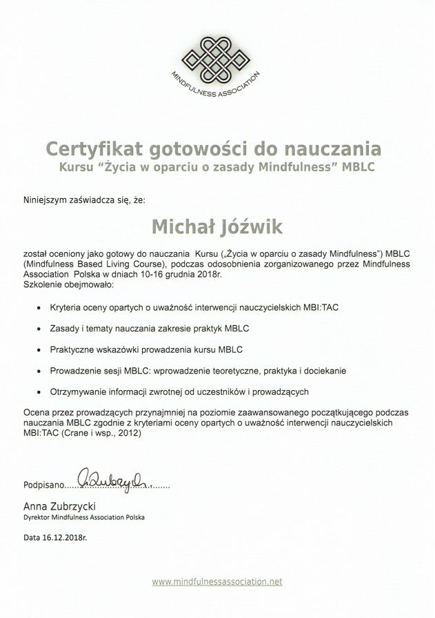 W pracy terapeutycznej wykorzystuję metody terapii schematów, terapii akceptacji i zaangażowania (ACT). Jestem certyfikowanym nauczycielem Mindfulness MBLC, a elementy uważności włączam w proces terapii tam, gdzie wspierają rozwój samoświadomości i regulację emocji.