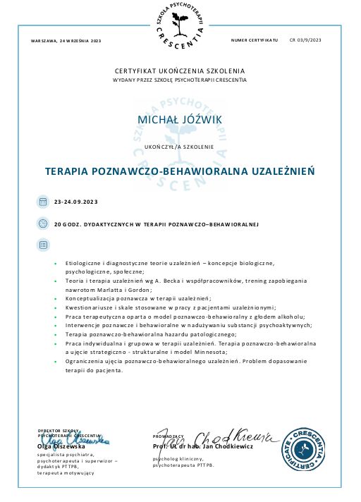 Pan Michał pomogł mi nie tylko z samoakceptacją i stawianiem granic, przedewszystkim pomógł mi z nałogiem z którym sama nie umiałam sobie poradzić. Pan Michał jest ciepłym, empatycznym człowiekiem na którego moge liczyć również pomiedzy terapiami. Polecam z calego serca każdemu kto ma ochote zmienić cos w swoim życiu.