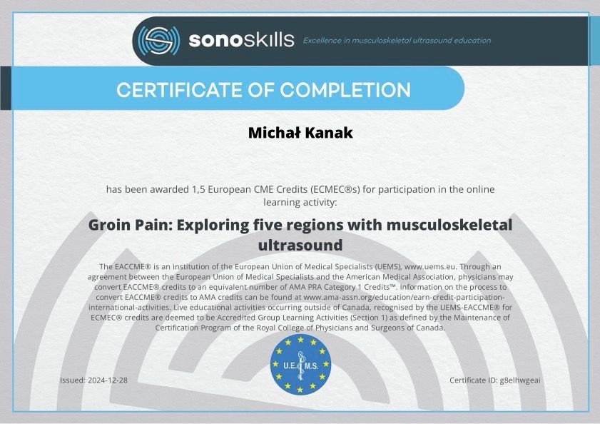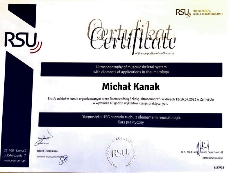 Jaki jest zakres porad oferowanych przez Michał Kanak?Michał Kanak to w trakcie specjalizacji (ortopeda), ultrasonografista. Na podstawie swojego doświadczenia i wykształcenia Michał Kanak oferuje usługi takie jak: USG stawów, USG stawu ramiennego (barku), USG stawu skokowego, USG stawu kolanowego, USG nadgarstka, USG stawu łokciowego, USG ścięgna Achillesa, USG stawu biodrowego, USG ortopedyczne, USG mięśni.