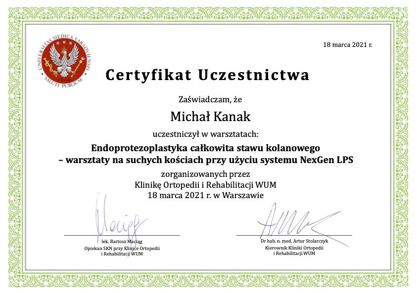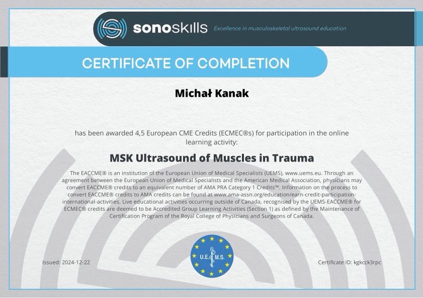 Jestem lekarzem w trakcie specjalizacji z ortopedii i traumatologii narządu ruchu, pracującym w Uniwersyteckim Szpitalu Klinicznym nr 2 w Łodzi w Klinice Ortopedii i Traumatologii. Równocześnie pełnię funkcję pracownika naukowo-dydaktycznego Uniwersytetu Medycznego w Łodzi, gdzie prowadzę zajęcia ze studentami oraz działalność badawczą. Opiekuję się Studenckim Kołem Naukowym Ortopedii i Traumatologii, a także sekcją dla studentów anglojęzycznych. Prowadzę kursy z ultrasonografii mięśniowo-szkieletowej dla lekarzy i fizjoterapeutów. Jestem autorem publikacji naukowych oraz prelegentem podczas krajowych i międzynarodowych zjazdów ortopedycznych.