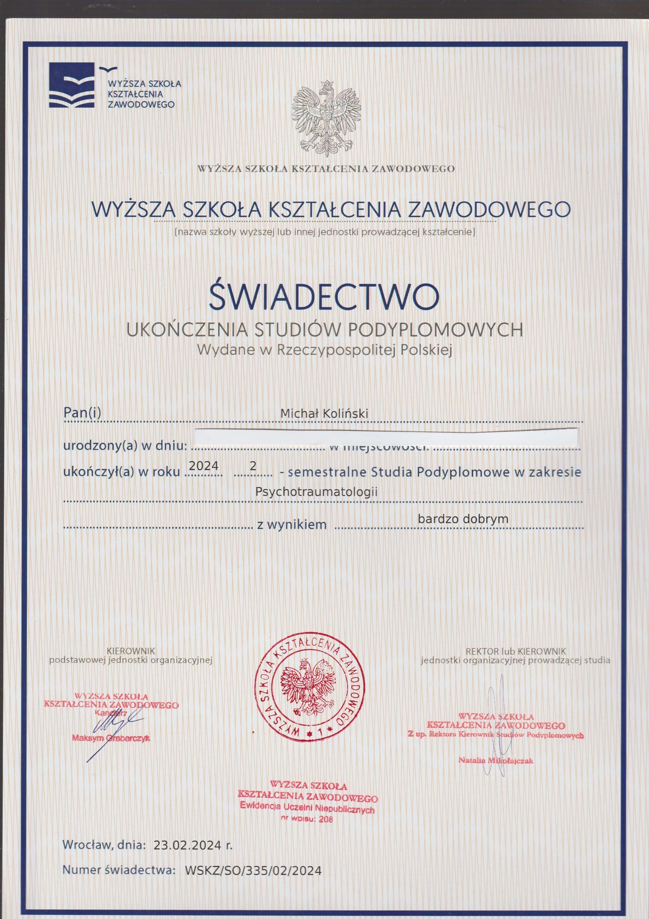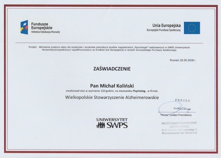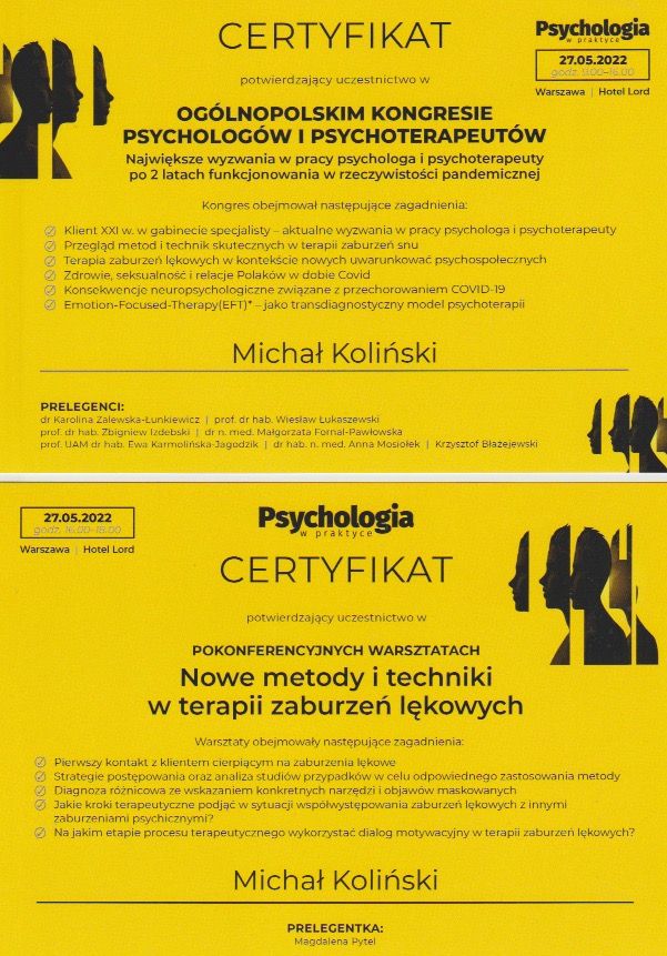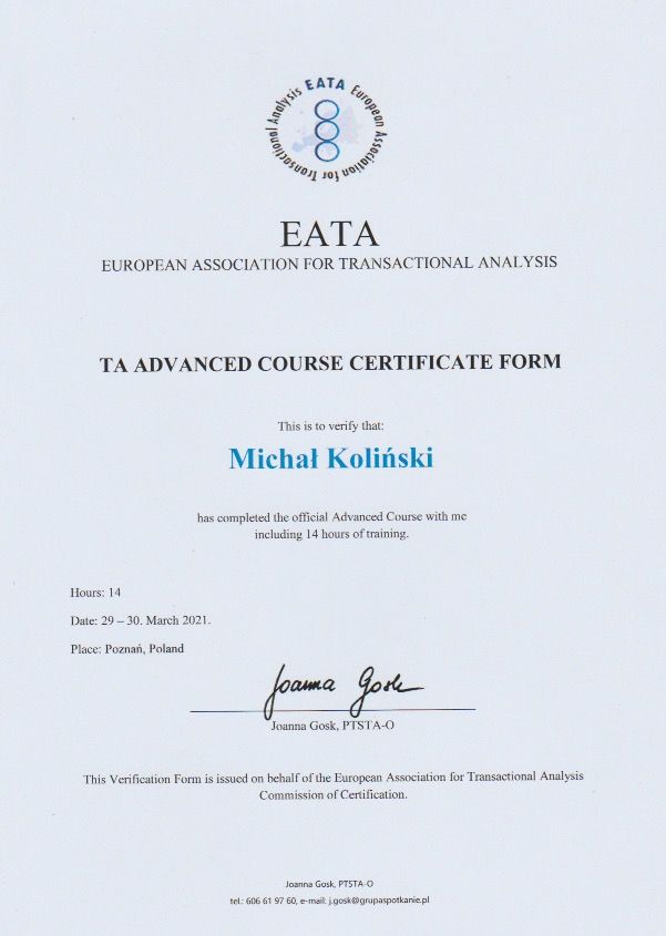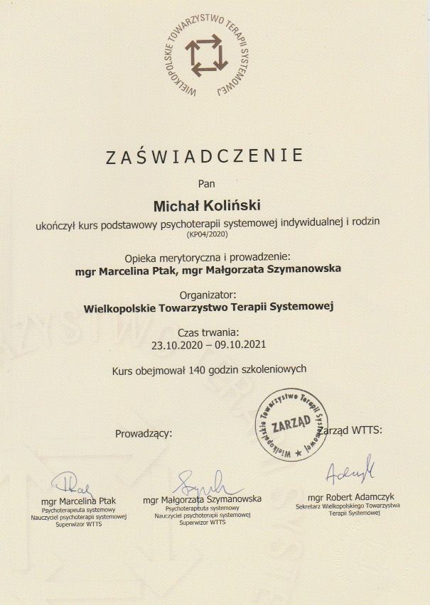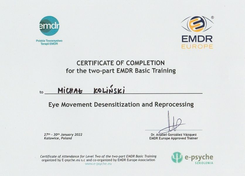 Ukończyłem psychologię kliniczną na Uniwersytecie SWPS, psychotraumatologię na WSKZ we Wrocławiu oraz liczne szkolenia z terapii EMDR, m.in. pod okiem dr Anabel Gonzalez Vazquez i dr Luca Ostacoli. Kontynuuję kształcenie w Wielkopolskim Towarzystwie Terapii Systemowej, zgodnie z wymogami Ministerstwa Zdrowia.