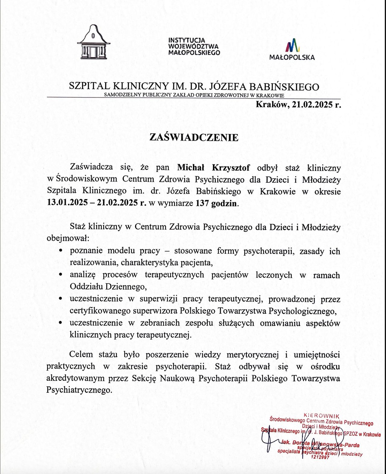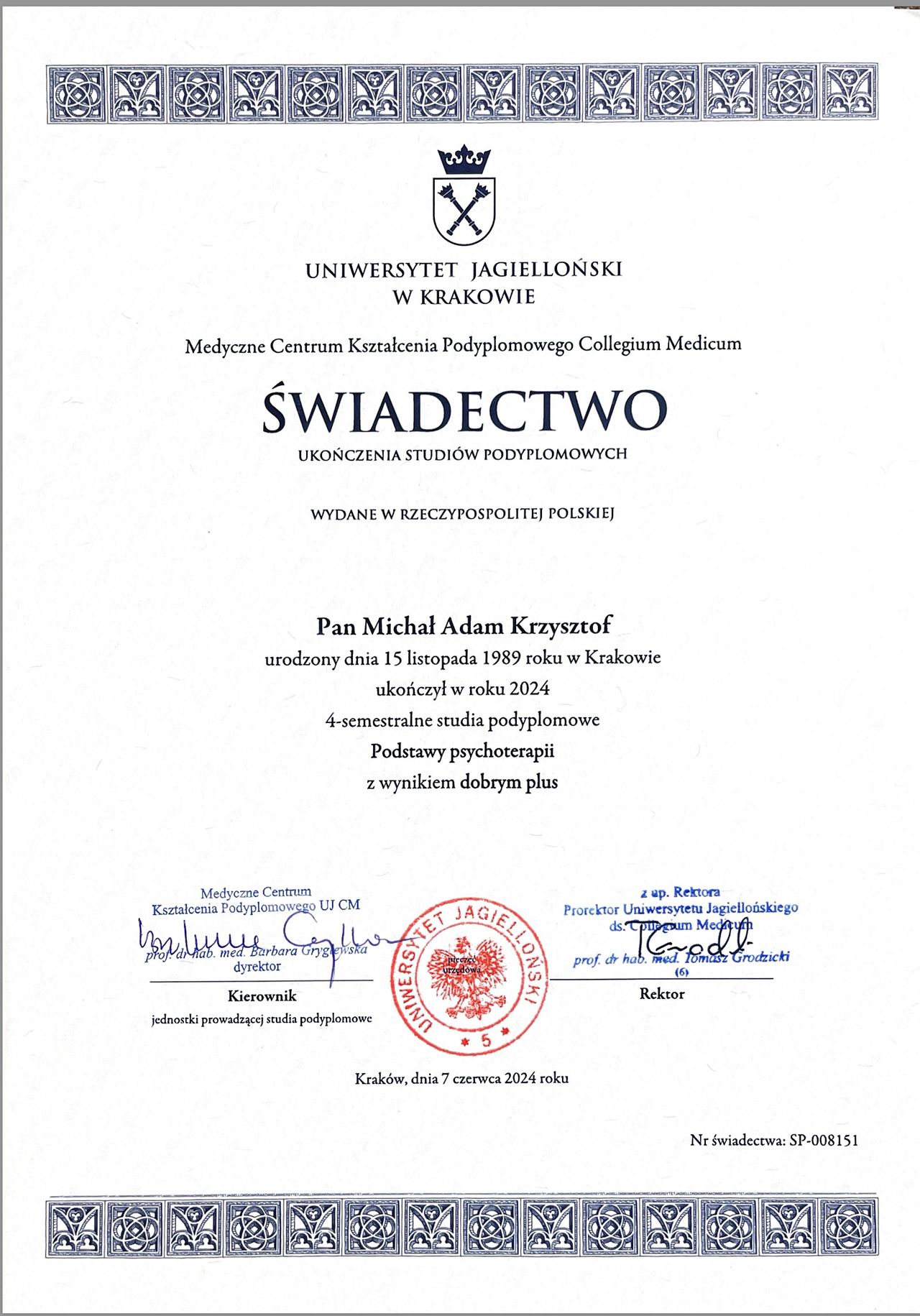 Jestem psychologiem Uniwersytetu Jagiellońskiego i psychoterapeutą w trakcie szkolenia Collegium Medicum UJ. Doświadczenie zawodowe rozwijałem współpracując z krakowskim Stowarzyszeniem Dobrej Nadziei, krakowskimi centrami psychoterapii, oraz w ramach staży w Szpitalu im. dr. Józefa Babińskiego w Krakowie na oddziałach dziennych i stacjonarnych. Jestem członkiem Polskiego Towarzystwa Psychiatrycznego. Od kilku lat uczestniczę w organizowanych przez PTP konferencjach naukowych i klinicznych, oraz biorę udział w seminariach z zakresu zaburzeń osobowości i wczesnych stanów umysłu. W pracy posługuję się metodą psychodynamiczną przy regularnych superwizjach. Wierzę przy tym w możliwość twórczej integracji innych podejść psychoterapeutycznych w pracy nad samoświadomością i dobroczynną zmianą funkcjonowania.