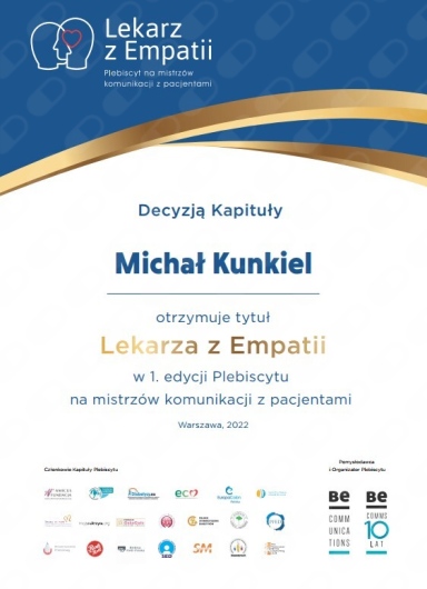 Jak Michał Kunkiel umawia wizyty?Michał Kunkiel używa kalendarza ZnanyLekarz, dlatego na stronie widzisz aktualne terminy. Wystarczy, że wybierzesz datę i godzinę, które odpowiadają Ci najbardziej. Umawianie wizyty jest darmowe, a tuż przed terminem wyślemy Ci przypomnienie.