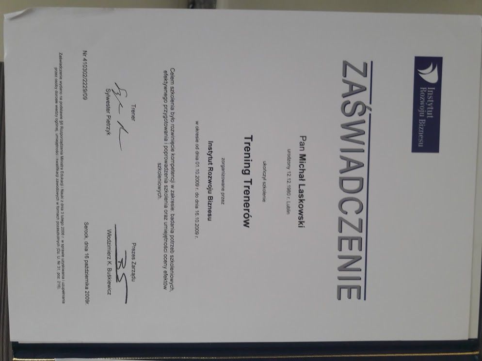 Posiadam dyplom psychologa wystawiony przez KUL. Obecnie jestem w trakcie 4-letniego szkolenia z psychoterapii poznawczo-behawioralnej w Centrum CBT. Ukończyłem Szkołę Trenerów LAB na poziomie zaawansowanym. Uzyskałem też certyfikat Kompendium MBA od Quest Change Managers.