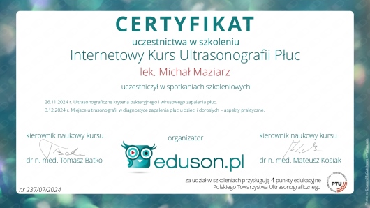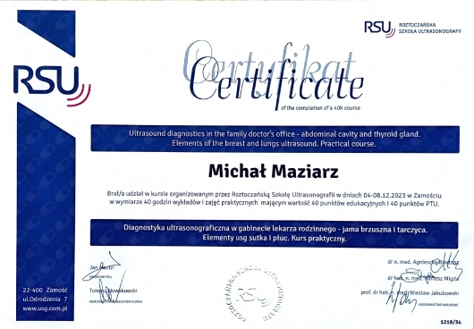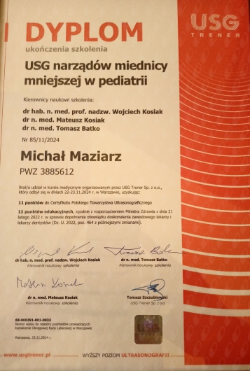 Jaki jest zakres porad oferowanych przez Michal Maziarz?Michal Maziarz to ultrasonografista. Na podstawie swojego doświadczenia i wykształcenia Michal Maziarz oferuje usługi takie jak: USG tarczycy, USG brzucha, USG stawu ramiennego, USG stawu kolanowego, USG stawu biodrowego, USG stawu łokciowego, USG stawu skokowego, USG jamy brzusznej, USG jamy brzusznej dzieci, USG Płuc u dzieci.