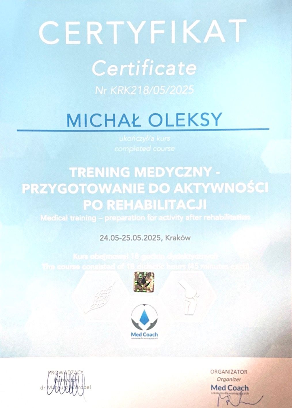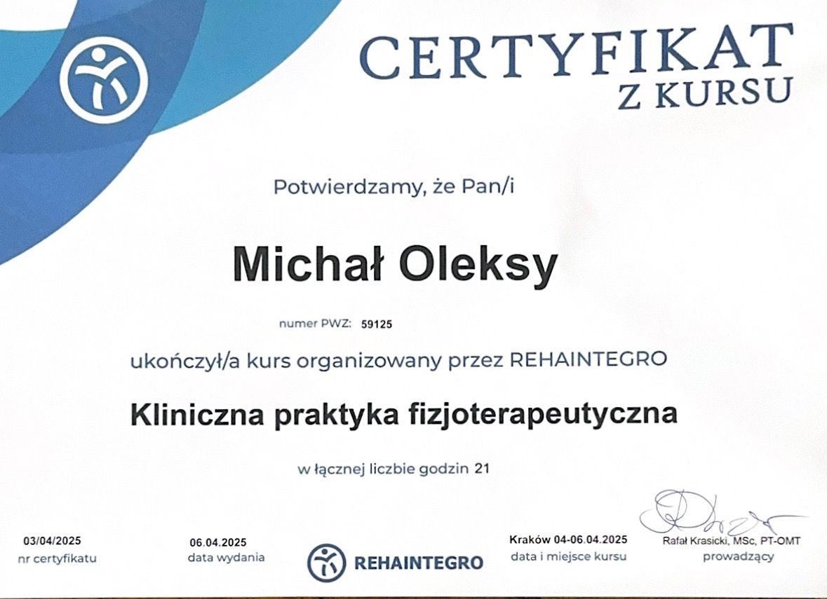 Nazywam się Michał i jestem magistrem fizjoterapii. Studia magisterskie ukończyłem w 2020 roku na Akademii Wychowania Fizycznego w Katowicach.