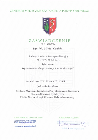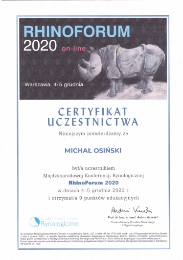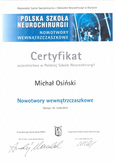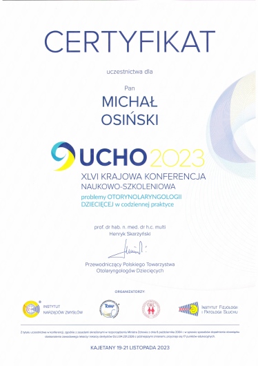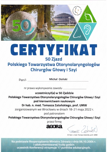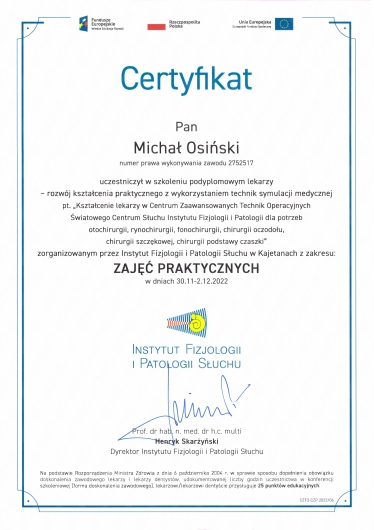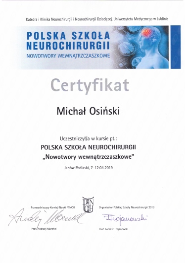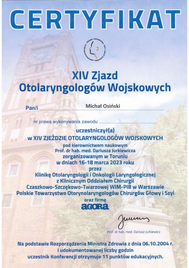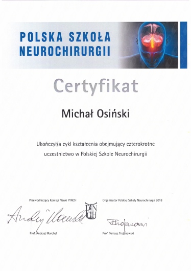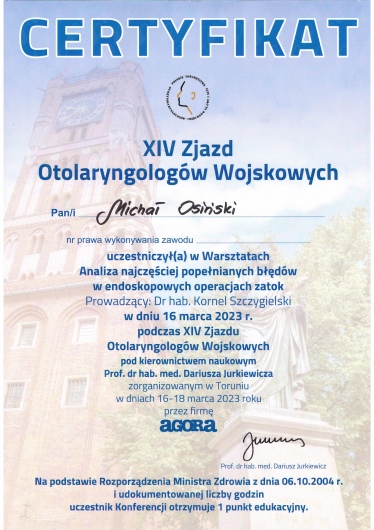W pracy jako Otorynolaryngolog staram się łączyć doświadczenie zdobyte podczas specjalizacji z Neurochirurgii co pozwala rozwijać również moje zainteresowania z obu dziedzin dotyczące leczenia bólów głowy, zaburzeń snu i operacji z pogranicza obu specjalności.