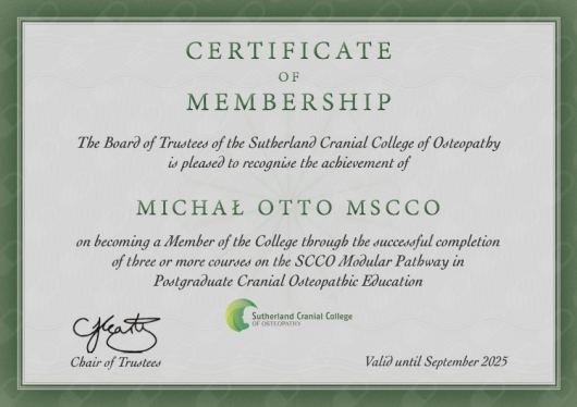 Dyplomowany Osteopata (D.O.), magister fizjoterapii, członek Sutherland Cranial College of Osteopathy (MSCCO). Ukończył 4-letni cykl szkoleniowy w Still Academy of Osteopathy oraz osteopatyczne studia podyplomowe BSW (Dyplomy przyznane na podstawie pozytywnego wyniku egzaminu praktycznego i teoretycznego oraz obronionej pracy dyplomowej). Absolwent studiów licencjackich i magisterskich Warszawskiego Uniwersytetu Medycznego kierunku Fizjoterapia. Obecnie kontynuuje edukację w Anglii w Sutherland Cranial College of Osteopathy. Postępowanie wedle filozofii medycyny osteopatycznej zakłada dążenie do zrozumienia mechanizmów prowadzących do występowania dolegliwości i wprowadzenie leczenia ukierunkowanego na przyczynę, nie objaw. W warunkach, gdy oddziaływanie przyczynowe nie jest możliwe, terapia ma na celu jak najlepsze wsparcie naturalnych procesów leczniczych organizmu. To podejście umożliwia pomoc pacjentom znajdującym się w blisko każdym stanie zdrowotnym.